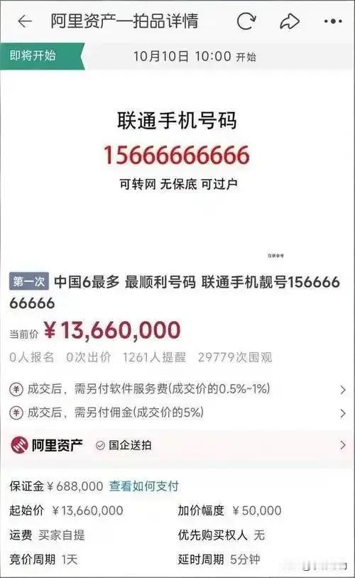 66次延时竞拍,最终以275万天价成交的手机号码,你见过吗?这个尾号66666666的手机号,不仅创下了拍卖纪录,还引发了一场不小的风波。 近日,一起特殊的拍卖吸引了众多网友的关注。一个尾号为66666666的手机号码,在经过66次延时竞拍后,最终以惊人的275万元价格成交。这个数字,不仅代表着吉祥和顺利,更成为了一种身份和地位的象征。然而,这场拍卖并非一帆风顺。据法官透露,竞拍者在成功拍下该号码后的5天内,如果选择悔拍,将面临高达40万元的保证金扣除。这一规定,无疑给这场拍卖增添了几分紧张和刺激。有网友表示,这个价格已经远远超出了手机号的实际价值,更像是一种虚荣心的满足。但也有网友认为,对于有钱人来说,这或许只是一种消遣方式,他们愿意为这种特殊的号码买单。 不管怎样,这场天价手机号的拍卖都引发了我们对消费观念和价值观的思考。你对于这场拍卖有何看法呢?快来评论区留言,和大家一起分享你的观点吧! 手机号 尾号手机号 豹子号手机靓号 13年手机号 手机号尾号吉凶 手机号拍卖 特殊号码价值