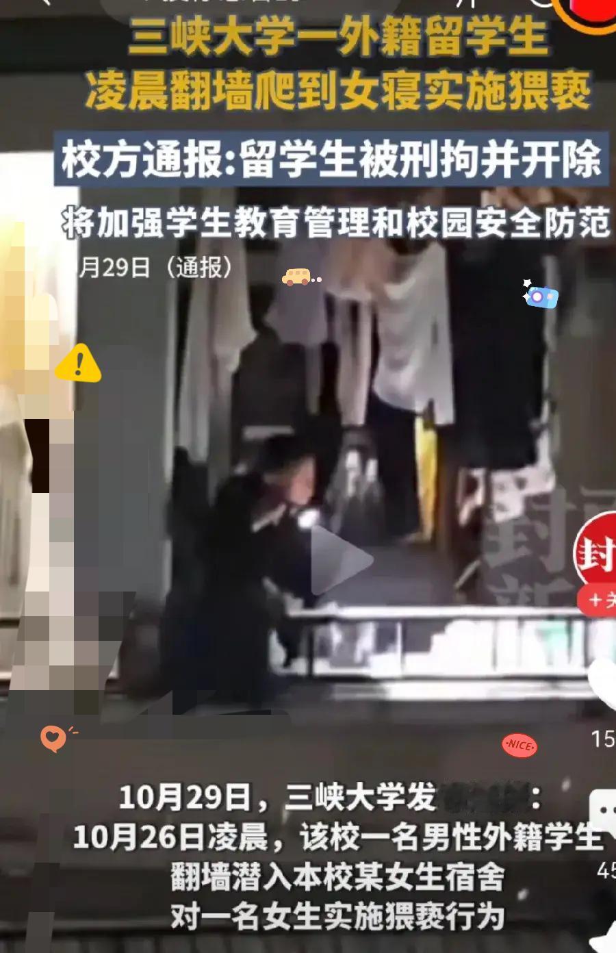 三峡大学一出事, 很多有女儿的家长表示非常担心, 他们表示: 有留学生和外教的学校不要去,某些学校靠留学生多来提高国际排名的学校,但这些留学生的素质良莠不齐,给孩子大学生活带来隐患。 万幸的是女生够勇敢,拼死反抗才没让对方得逞,但这绝不能成为轻拿轻放的理由。 问题的核心从来不是“留学生”这个身份,而是学校监管的漏洞和对违法者的零容忍态度。 能精准翻墙、摸准路线,显然是蓄谋已久,这背后暴露的是宿舍安保的形同虚设。 加装铁门铁丝网只是治标,学校更该做的是把监管落到实处,不管是留学生还是本土学生,违法就得一视同仁。 该立案的立案,该坐牢的坐牢,刑满后坚决驱逐,这才是给受害者和家长的交代。 校领导也必须担责,公开道歉、公示处理结果,别让声誉危机变成信任崩塌。