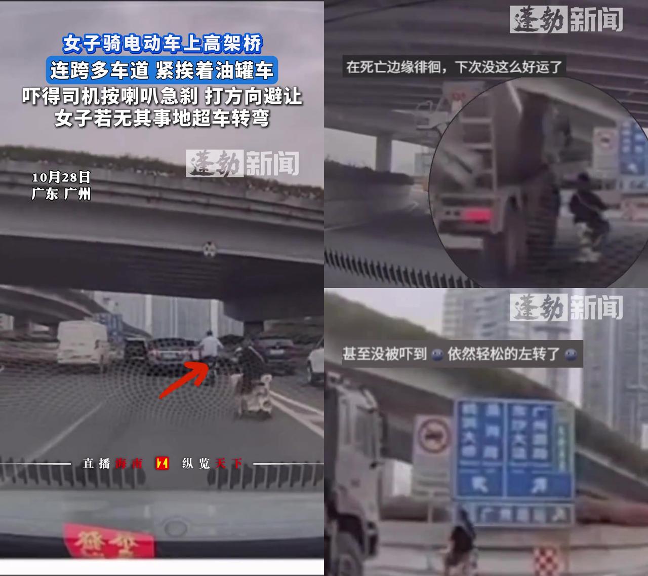油罐车司机的手都抖成筛子,她却连头都没回! 广州高架这幕,我看了三遍才敢信,10月28日,一女子骑电动车上高架,连跨3个车道,直接贴到油罐车旁边。 谁不知道油罐车是“移动炸弹”?去年高速上一辆侧翻,100米外的车都被气浪掀飞! 司机拼命按喇叭,手指都酸了,急刹时座椅往前滑,打方向差点蹭到护栏,她倒好,拧了拧电动车把手,超完车还慢悠悠转弯,跟逛菜市场似的。 有人说她胆大,可这哪是胆大?是脑子根本没装“怕”字!有人评论说“下次还敢”,我看了直冒冷汗, 她赌的哪是运气,分明是整条高架的人命!油罐车要是急刹侧翻,她那小电动车能扛住?旁边的车能跑掉? 你遇过这种无知者无畏的骑手吗?要是你在现场,敢不敢喊她一句“油罐车会爆炸啊”? 规则从来不是管你,是帮你“怕”对地方,有些险,真的赌不起! 大家怎么看?