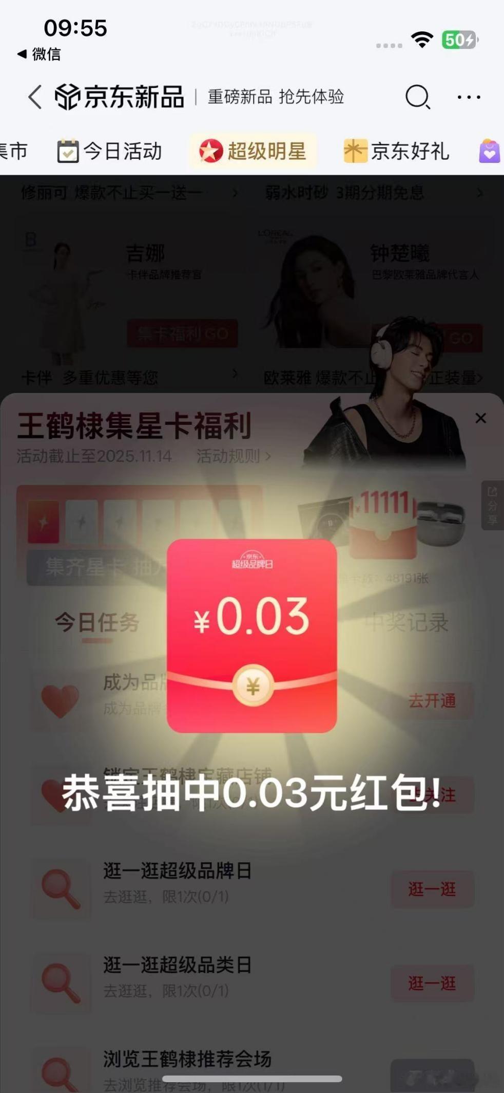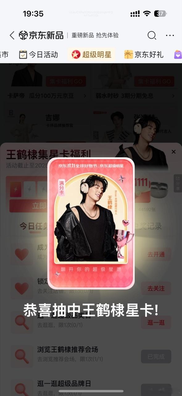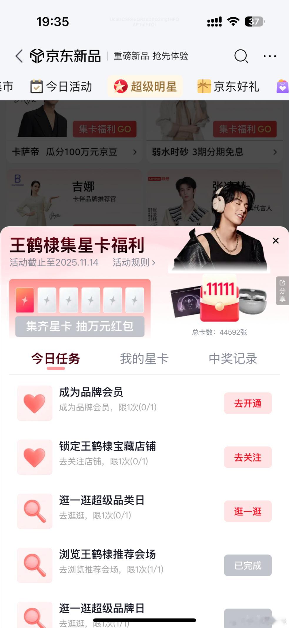 来京东集超级星卡抽万元红包来京东集超级星卡抽万元红包咱们兄棣伙怎能不为他打call?快来京东超级品牌日,参与棣棣的集明星星卡活动,为棣棣应援!只要参与活动集卡1张就能抽奖哦,红包、京豆等你来!还有机会赢取万元京东红包,集满卡更有棣棣的周边签名等你拿!别犹豫了,上京东搜索“集明星星卡”,抽亲签周边、实物奖品等惊喜好礼,更有至高11111元红包补贴哦~]今晚8点京东11.11连续3天疯狂加补京东11.11 又好又便宜速戳