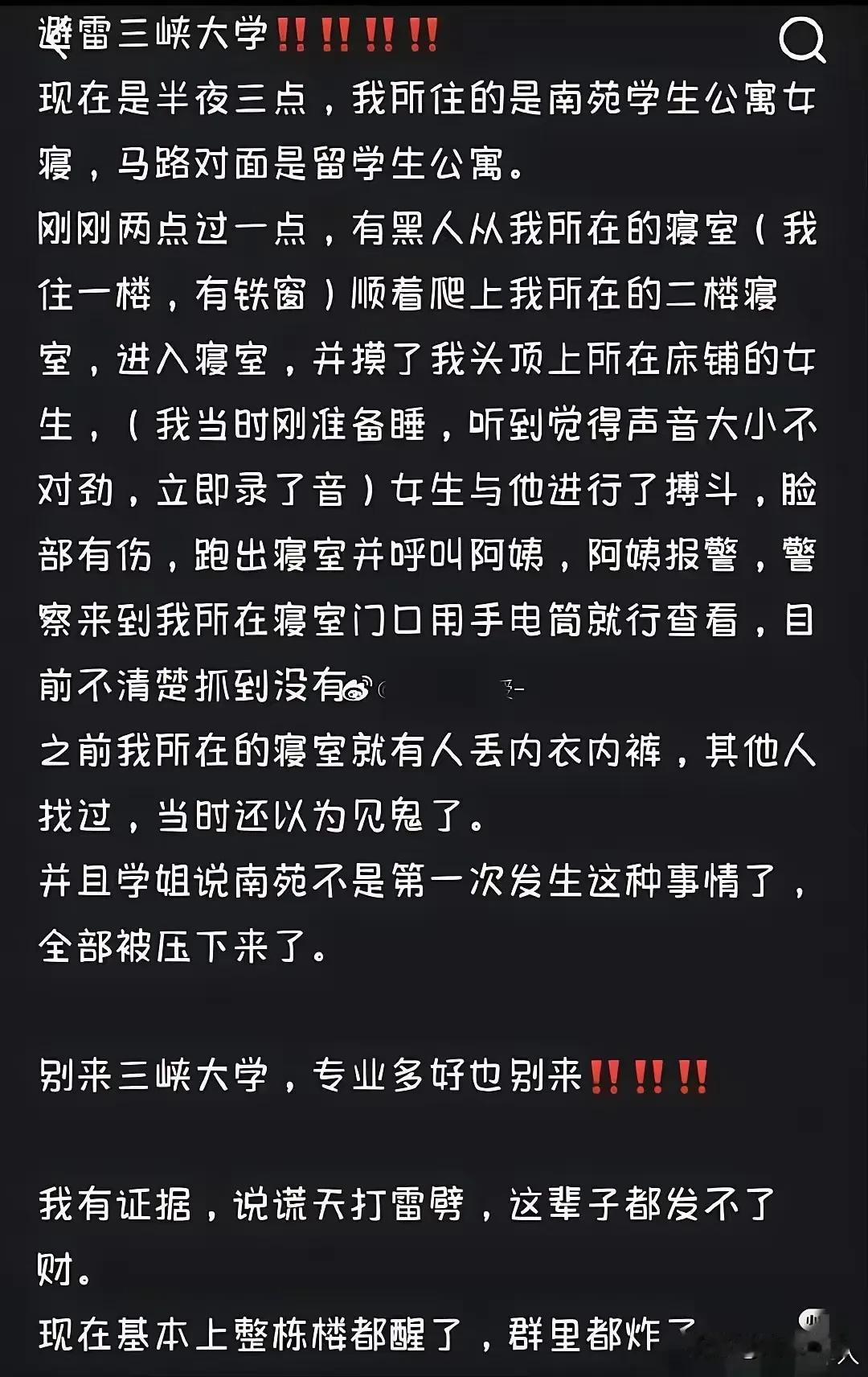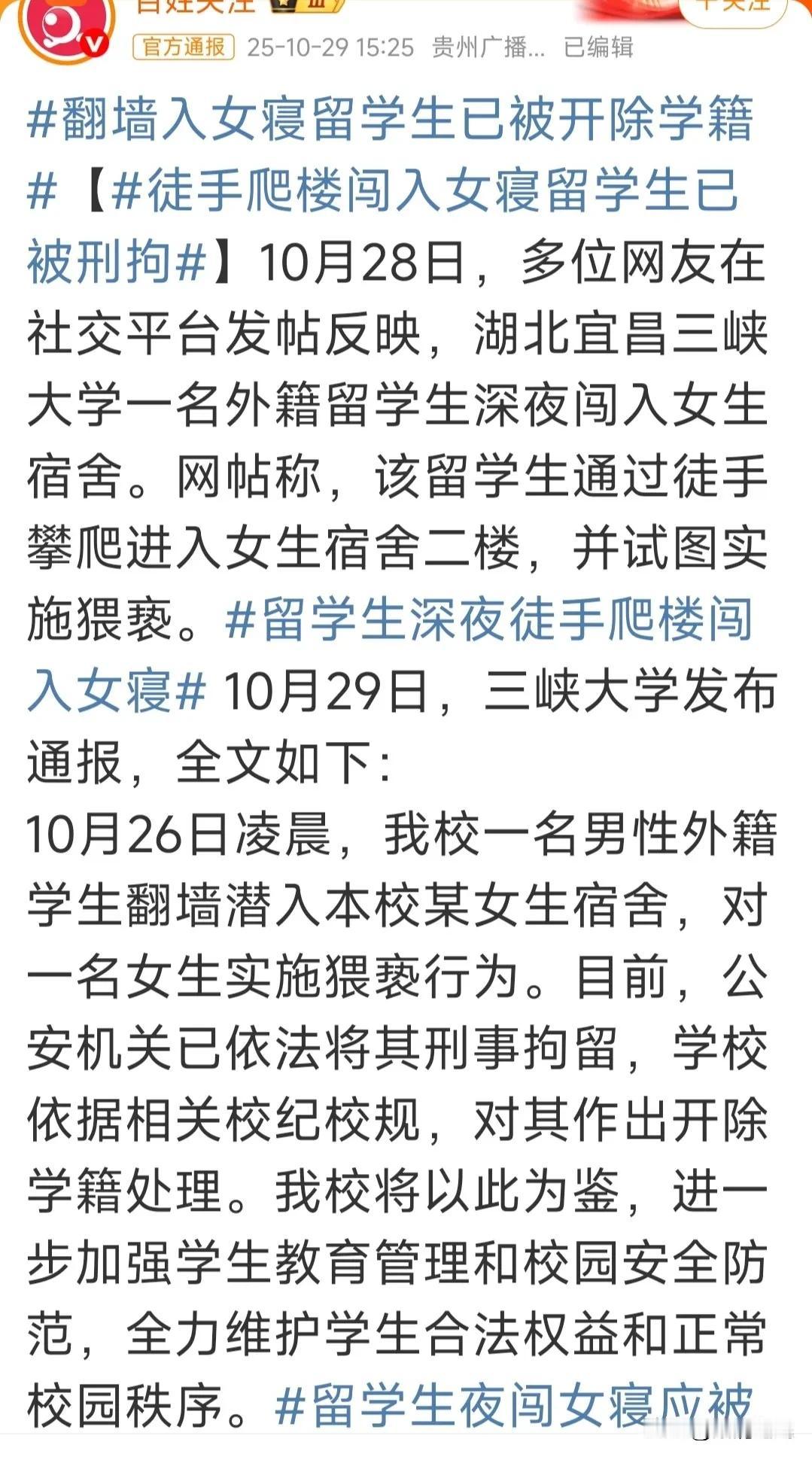 外籍留学生校园违法屡禁不止的根本原因是:出现问题后,学校领导考虑的不是惩罚留学生,而是第一时间想尽一切办法压住新闻防止蔓延! 只有压住新闻蔓延,才能保住他们的脸面,至于受害人的权益,尽可能缩小缩小再缩小,实在不行用学籍和毕业证书要挟,使得受害人敢怒不敢言! 不过法律法规制度应该是,出现这种情况,直接处理直接领导保证百分之百没有再出现。 学院院长首先是半个官,也要遵守社会主义核心价值观!拿祖国的花朵来当赌注,家长就甘情愿当这个冤种? 教育界必须改革,刮骨疗毒,固本清源。 部分高校对留学生的过度优待已演变为一种“敬畏心”,唯恐其有丝毫不满。这种无底线的纵容,是对校园规则与公平基石的直接破坏。