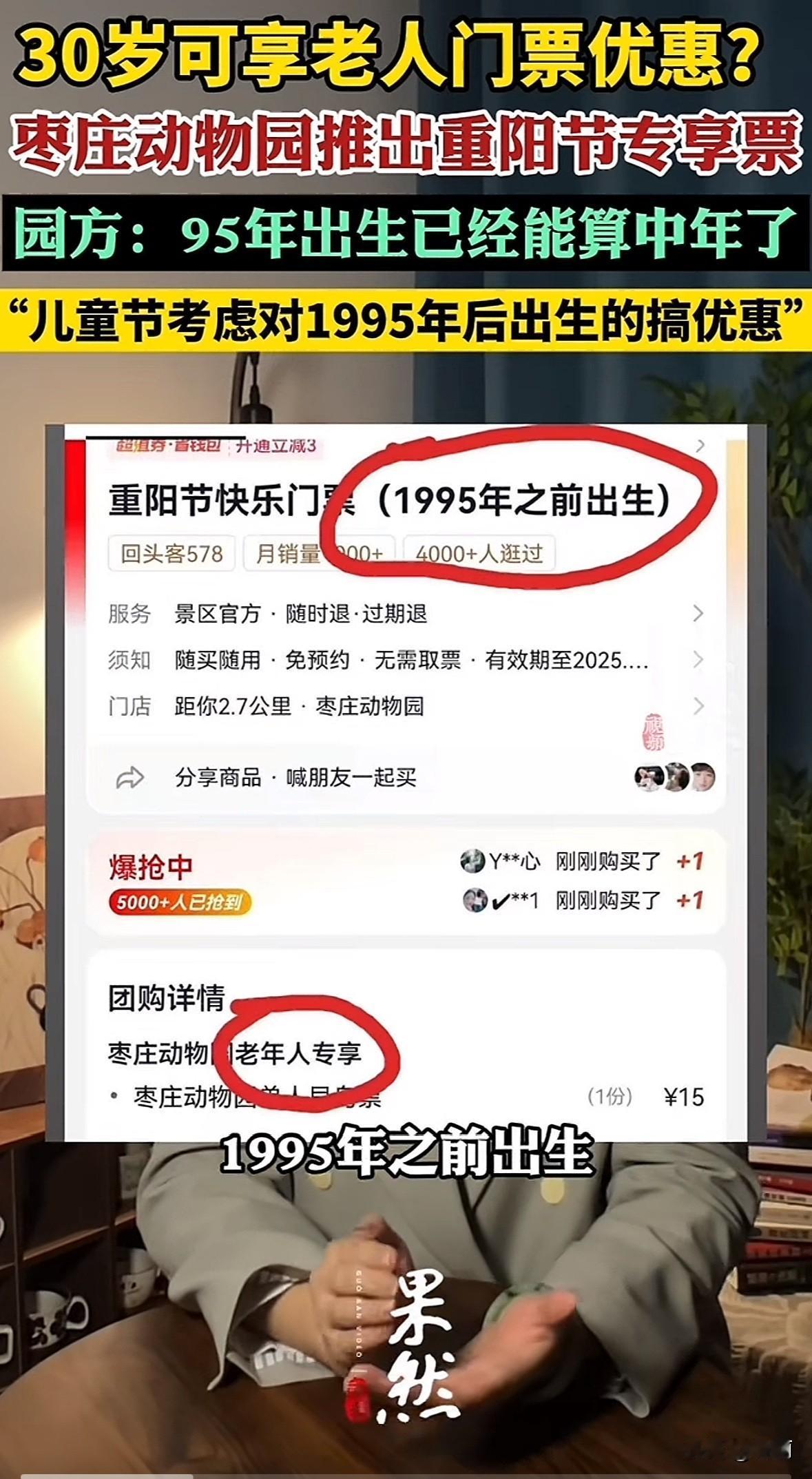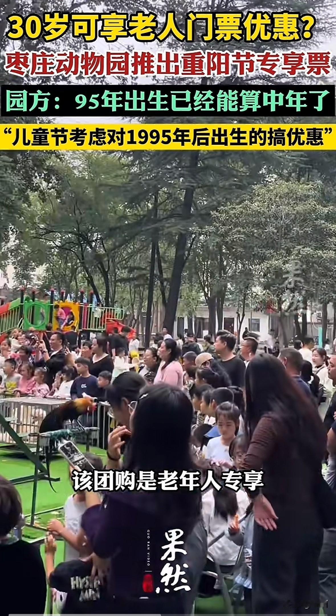 山东枣庄动物园重阳节推出“老年人专享”优惠票,1995年之前出生(30岁及以上)游客花9.9元就能入园,原价15元的早鸟票,这票两天卖了6000多张。 网友都在调侃,30岁就成“老年人”了。园方说就是觉得有趣,想给30-60岁群体送福利,让他们买特价票带父母来,不是真把30岁归为老人,现在购票链接已经下架了。 其实30岁群体正处在“夹心层”,上要考虑父母养老,下要操心子女成长,生活关键词多是忙碌、焦虑。这种营销能火,是戳中了他们的压力点。 但比起“中老年”这种调侃,他们更需要实际的时间和经济支持。文旅营销搞创意没问题,像成都雪村那样虚假宣传不行,但也得选对方式,别让好意变争议。