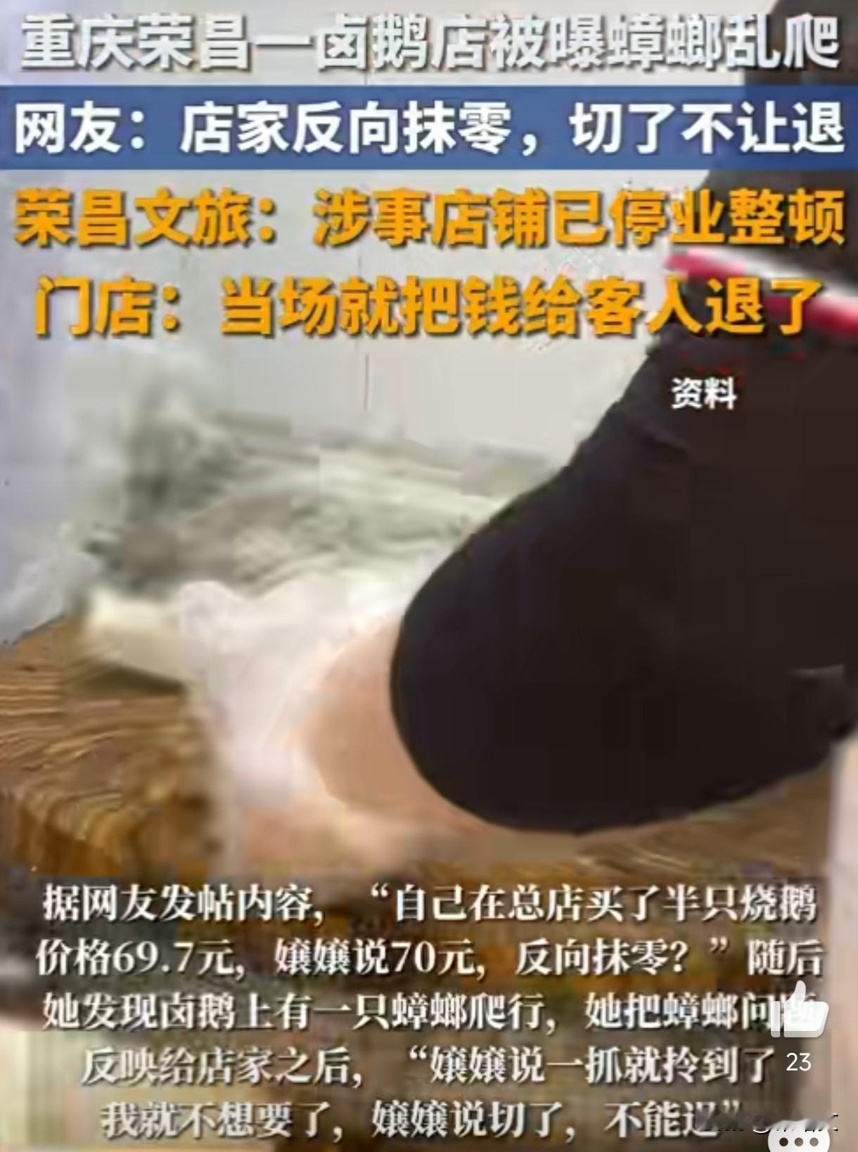 卤鹅店太埋汰!蟑螂乱爬还反向抹零,停业整改能洗白? 重庆荣昌这卤鹅店可太坑了!有人去买卤鹅,不仅被商家反向抹零多收钱,还瞅见店里蟑螂到处爬,找店家退钱还遭拒,拍了证据才给退,这操作谁能忍? 10月29号这事儿爆出来,网友都炸了锅。买东西被多收钱就够膈应了,还撞上蟑螂乱爬,这卫生条件简直没眼看。店家倒好,一开始还嘴硬,直到人家拿出照片才乖乖退款。 面对质疑,店家说自己当场就退钱了,还辩解每周都大扫除。可这蟑螂满地爬的样子,哪像大扫除过的?明显是卫生糊弄事,现在说这话,谁信啊?也就是找借口遮羞罢了。 更气人的是“反向抹零”这操作。现在移动支付明明能精准到分,非要多收那几毛,别小看这小钱,积少成多可不是个小数目。之前重庆有家餐馆就因为这事儿被投诉,市场监管局直接给了警告。 这可不是小事,法律早有说法。《价格法》里明确说了,不能在标价外多收费用,反向抹零涉嫌违法。厦门有家餐饮店就因为多收5毛钱,被罚了四千多,这教训还不够深刻吗? 再说卫生问题,蟑螂乱爬已经违反了食品安全规定。按《食品安全法》,遇到这种情况,消费者不光能要求退款,还能要十倍赔偿,不足一千块的按一千算,这可是实打实的保障。 现在店家说要停业半个月到一个月重新装修,文旅局也证实在整顿,市场监管局也介入了。可装修能解决根本问题吗?要是卫生意识、诚信经营的根儿没变,整改完还得犯老毛病。 之前有糕点店因为电子秤精度问题,每次多收4分钱,最后被罚了2600块。这说明不管钱多钱少,坑消费者就没好下场,监管部门根本不会惯着这种歪毛病。 遇到这种事,可别忍气吞声。得像这位爆料的网友一样,先拍好照片、留好付款凭证,固定证据。然后直接找店家维权,不给解决就打12315找市场监管部门,实在不行还能走法律程序。 有些商家总觉得“几毛钱不算事”“蟑螂小问题”,可做生意讲究的就是诚信和卫生。缺了这两样,就算装修得再豪华,也留不住顾客。毕竟谁也不想花钱买气受,更不想吃有卫生隐患的东西。 这次监管部门介入是好事,但后续得盯紧点。别让店家走个“停业装修”的过场就完事,得从根源上查问题、改毛病,还得把处理结果公开,让其他商家也长长记性。 要是你买东西遇到反向抹零,还看见店里有蟑螂,会当场跟店家较真,还是默默忍了?其实咱越较真,商家才越不敢糊弄,消费环境才能更舒心。