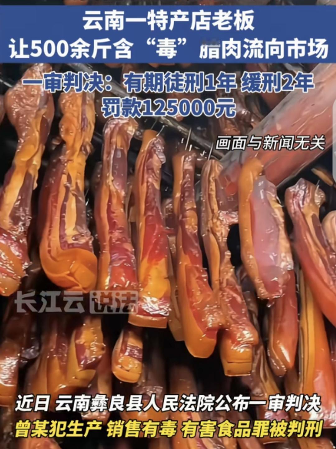 “真是丧尽天良!”云南彝良,一名男子将500斤腊肉挂在墙上,先后两次往肉上喷洒敌敌畏,随后将这些腊肉卖出1万多元。可好景不长,男子的恶行最终败露,经抽样检测,这批腊肉的敌敌畏含量为0.06-1.1mg/kg。男子最终被罚款12.5万元,判处有期徒刑1年,缓刑2年,这样的判决引发了大众的不满。网友纷纷质疑:这样的情况都能判一缓二?难道食品安全问题就这么不受重视吗! 这名男子叫曾某,在彝良县开了家特产专卖店,专卖腊肉、腌制品这类当地特色美食。按理说,做特产生意靠的是口碑,食材新鲜、工艺地道才能长久,可曾某眼里只有短期利益。2024年4月,他看着店里挂着的几百斤腊肉担心生虫变质,不想花成本做正规防腐处理,竟想起用敌敌畏“省事”——这种有机磷杀虫剂对人畜毒性极大,早就明令禁止用于食品加工,他却抱着“喷一点看不出来”的侥幸,兑水后往腊肉上、墙面和空气中喷了一遍。到了8月,见没出问题,他又喷了第二次,之后便心安理得将这些带毒的腊肉、猪脚销往市场,5个月卖了500多斤,赚了1万多元。 更让人揪心的是,这不是云南第一次出现“毒腊肉”事件。同期会泽县的彭某,用同样手段喷洒腌肉制品,涉案量超2.6吨,最终被判有期徒刑2年4个月,罚金22万元。同样是喷洒敌敌畏,同样触犯生产、销售有毒、有害食品罪,曾某的判决却轻了不少,难怪网友愤怒。根据法律规定,这个罪名只要实施就构成犯罪,一般情节处五年以下有期徒刑,原则上不应轻易适用缓刑。曾某能获得缓刑,大概率是因为案发后认罪认罚、退缴了违法所得,被认定为“犯罪情节较轻”。 可“情节较轻”的标准到底是什么?500斤腊肉流向市场,可能被上百个家庭食用,敌敌畏残留会加重人体肝脏负担,长期摄入可能引发肠胃疾病,甚至造成更严重的健康损害。对消费者来说,他们花血汗钱买特产,没想到买回家的是“慢性毒药”,这种伤害不仅是身体上的,更是对食品安全信任的打击。曾某的违法成本,不过是12.5万元罚款(还不及一些商家的单月利润)和不用坐牢的缓刑,这样的惩罚真能起到震慑作用吗? 有人说法律要讲宽严相济,但食品安全是底线中的底线。往食品里加剧毒农药,本质上是漠视他人生命健康,这种行为绝不能轻易“网开一面”。如果违法者只需付出微薄代价,就可能有更多人跟风效仿——毕竟1万多元的利润,对比12.5万元罚款和缓刑,对逐利者来说未必是“亏本买卖”。更关键的是,类似案件屡禁不止,恰恰说明当前对这类行为的震慑力还不够,监管和处罚的力度需要进一步加码。 食品安全从来不是小事,它关系到每个家庭的餐桌安全,关系到整个社会的信任体系。曾某的案件判决,看似符合法律条文的从轻情节,却忽略了食品安全犯罪的特殊性——它危害的是不特定多数人的健康,影响的是公共利益。我们不能苛求每个商家都有高尚的道德,但必须通过严格的法律制裁,让他们不敢触碰红线。 为什么“毒食品”总能出现?是监管存在漏洞,还是违法成本太低?同样的罪名,不同的判决,如何才能让量刑更公平、更有震慑力?这些问题值得每个人深思。食品安全需要零容忍,只有让违法者付出沉重代价,才能守住我们的餐桌安全。各位读者你们怎么看?欢迎在评论区讨论。