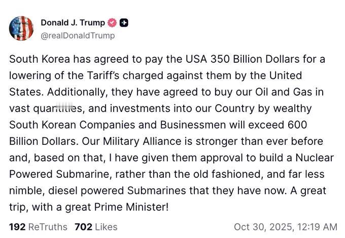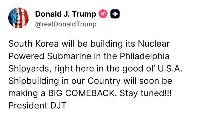 美国总统老特在“真实社交”上发文称,他已批准韩国建造核潜艇,将在美国费城造船厂建造,美国造船业将迎来强势复兴。对此该怎么看呢?首先,老特是唯恐天下不乱,他在二度入主白宫之后的一系列疯批动作将全世界搅得更加动荡,尤其是不断打压中国。现在同意韩国建造核潜艇,是紧紧将韩国绑在美国战车上的举措,让韩国作为美国遏制中国的马前卒;其次,老特在给韩国画大饼。也就是既以空头许诺让韩国去帮助美国遏制中国,同时又防止韩国真的拥有核潜艇。实际上,老特说的很清楚,批准韩国建造核潜艇,但不能在韩国本土船厂建造,必须在韩国韩华集团去年12月收购的费城造船厂建造,而且要实现的是美国造船业的强势复兴。说白了,老特是想以此提振美国造船业,不是真的让韩国拥有核潜艇。美英澳的“奥库斯”联盟,澳大利亚还不知道啥时候才能有核潜艇呢,韩国算老几。“非我族类,其心必异”,老特可不认为非盎-撒系的韩国比盎-撒系的澳大利亚还忠心,给韩国画个饼就得了。 最后说结论吧,韩国最终啥也得不到,但对美国来说会收获颇丰。一是画个大饼,破坏中韩关系,阻止韩国靠向中国,让韩国去遏制中国。韩国很有可能被美国的大饼诱惑,去追随美国遏制中国;二是让韩国在美国进行更大的投资。在老特画的大饼之下,韩国很可能会向费城造船厂大举投资,同时对老特之前要求的韩国在美投资3500亿美元也不再抵触。如此一来,美国就赚大了。至于韩国的核潜艇梦想,老特等到韩国在美投资差不多了,然后一翻脸,韩国就只剩下哭了。