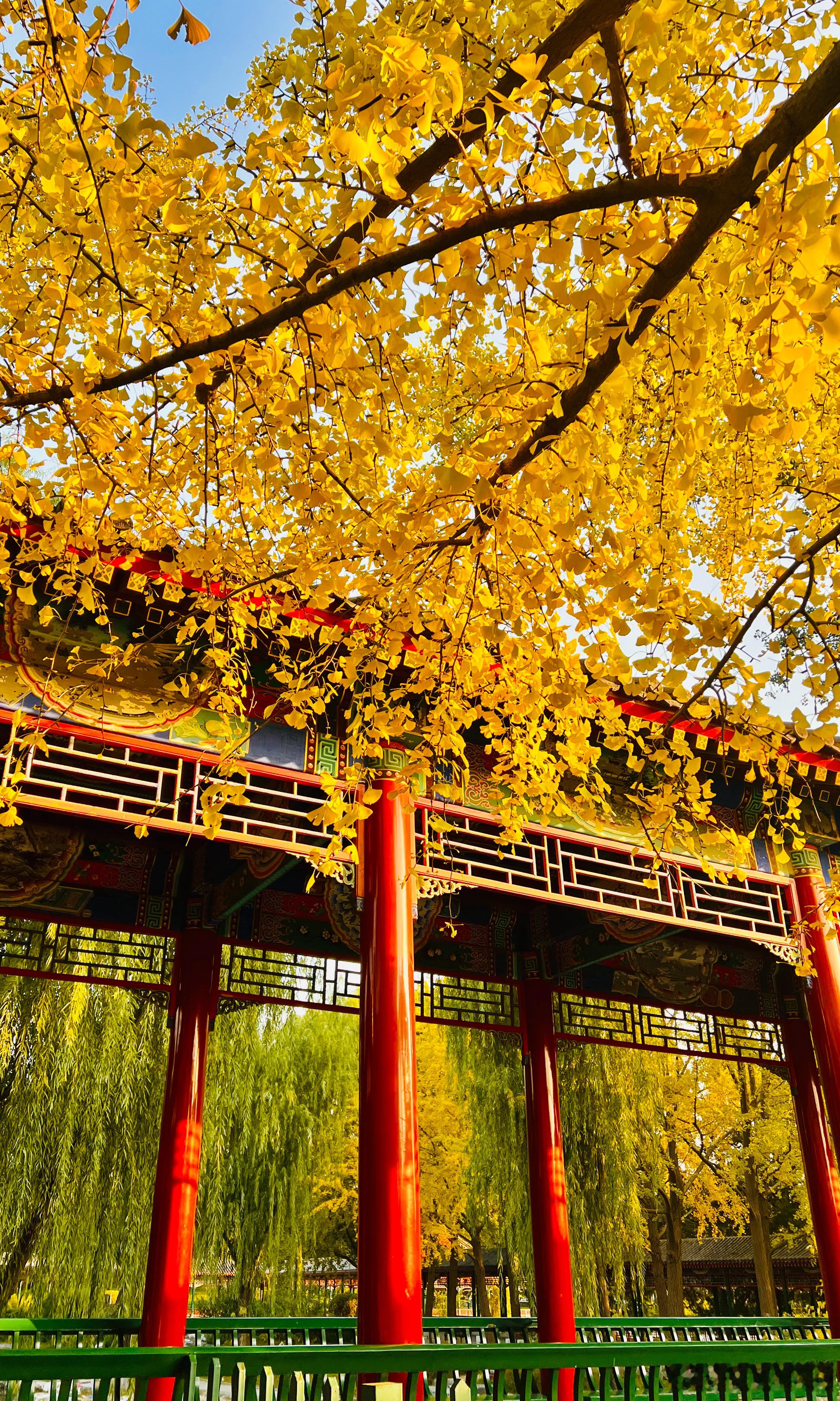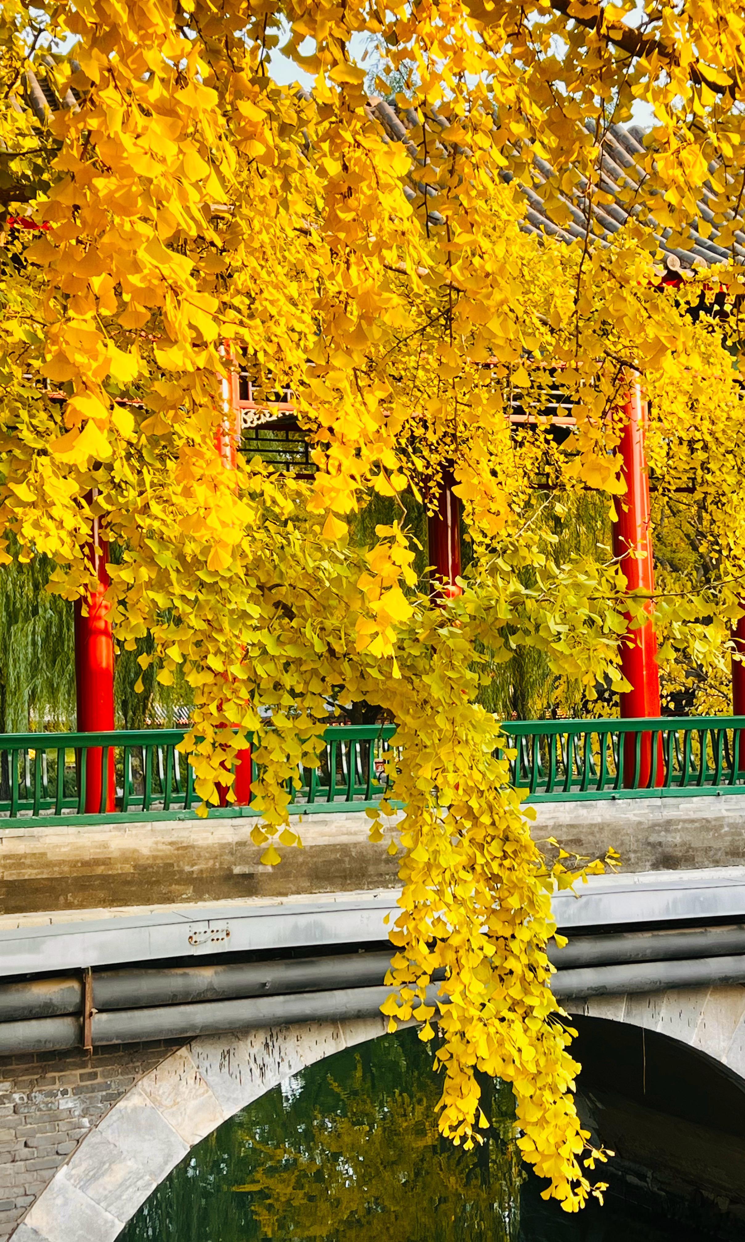亮马河秋韵 深秋午后,阳光如金。柳树泛着柔和的金辉,仿佛整条河流都