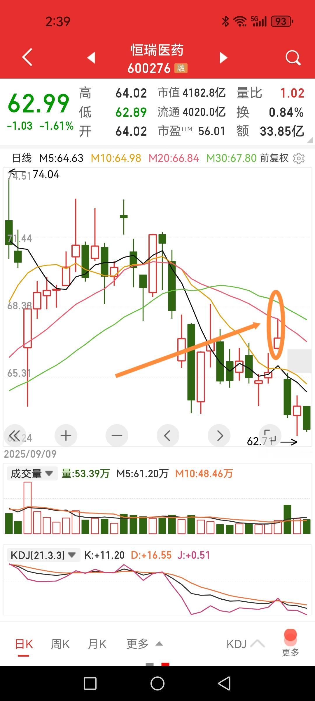 恒瑞医药,10月27日这个诱多上冲把人给骗惨了。 当天大盘跳空高开,满盘都是热火朝天的架势,恒瑞医药也是高开冲高后回落震荡,当天并看不出来什么问题。 结果第二天大幅跳空低开,最后收盘大跌超5%,这下才知道头一天是诱多,可惜已经晚了。 说明:小编并未参与,只是作为案例分析。
