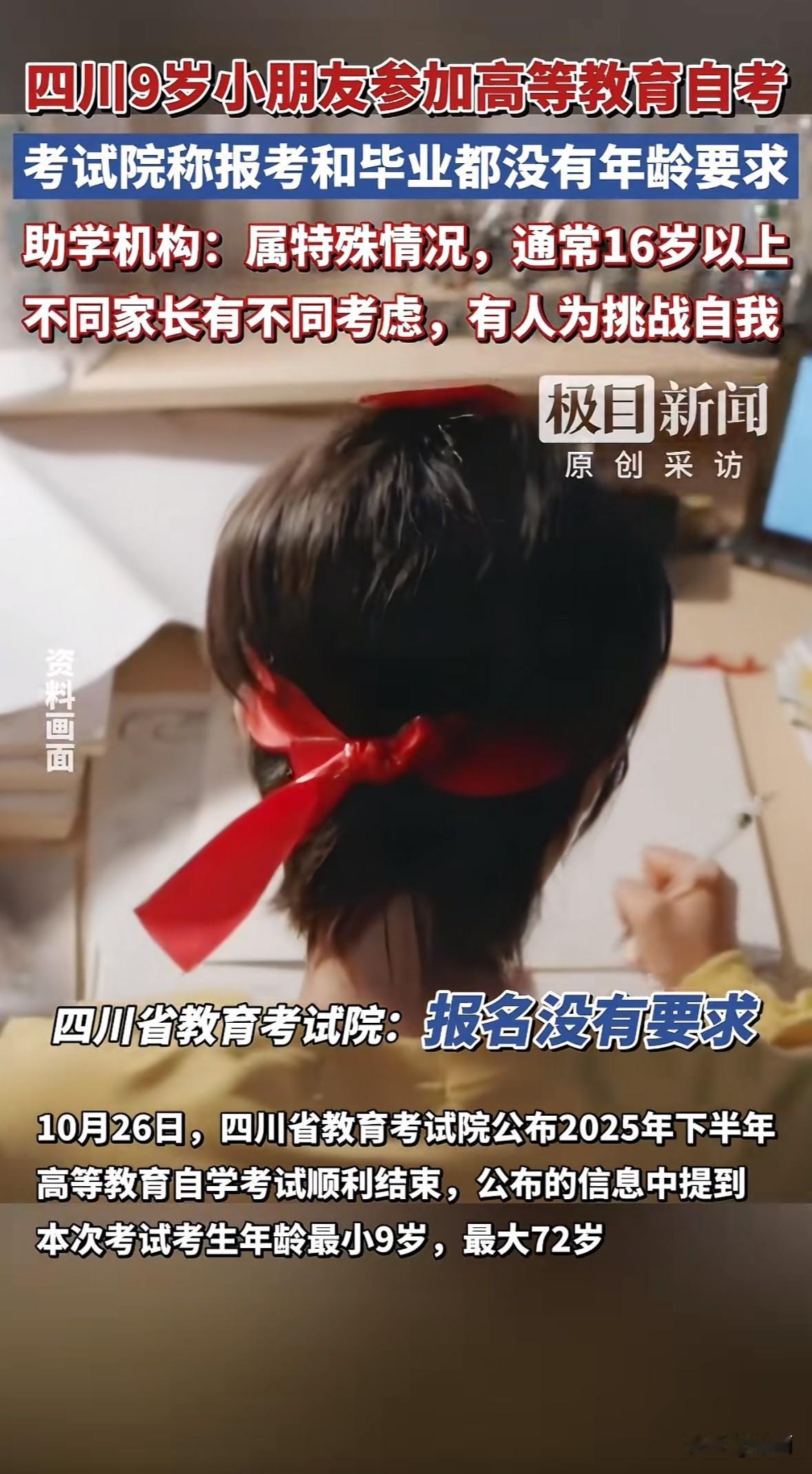 2025年下半年四川自考结束,考生里最小的才9岁,最大的72岁。省教育考试院说这孩子报考专科属实,符合规定,前两年还有8岁考生参加过。 这9岁娃2015年生,报了川农行政管理专业,在成都树德实验中学考试,助学机构说他学习好,是主动学的。 网友看法不一样,有人夸他厉害,有人担心教育内卷太早,挤掉童年。 教育专家李涛说,自考没年龄限制,制度上没问题,但不符合儿童发展规律。9岁本该上小学,打基础、交朋友,过早考自考容易知识偏食、社交能力跟不上,就算有天赋,拔苗助长也可能伤了成长的平衡性。