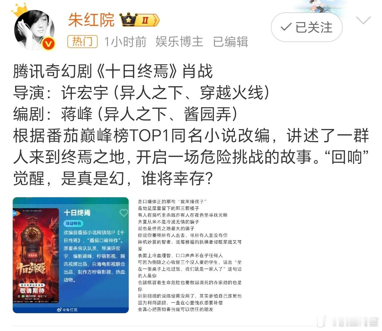 十日是🍅的顶级好饼了,番茄的版权改编至今都是在短剧届称王称霸,还没有在长剧圈里证明过自己,影视改编想找顶流是真的能看到他们的野心了,制作方还是正在和肖战合作的柠萌,可能性很大诶。毕竟这部剧如果真的能死磕到肖战的时候,制作费用就能回本了十日终焉 肖战