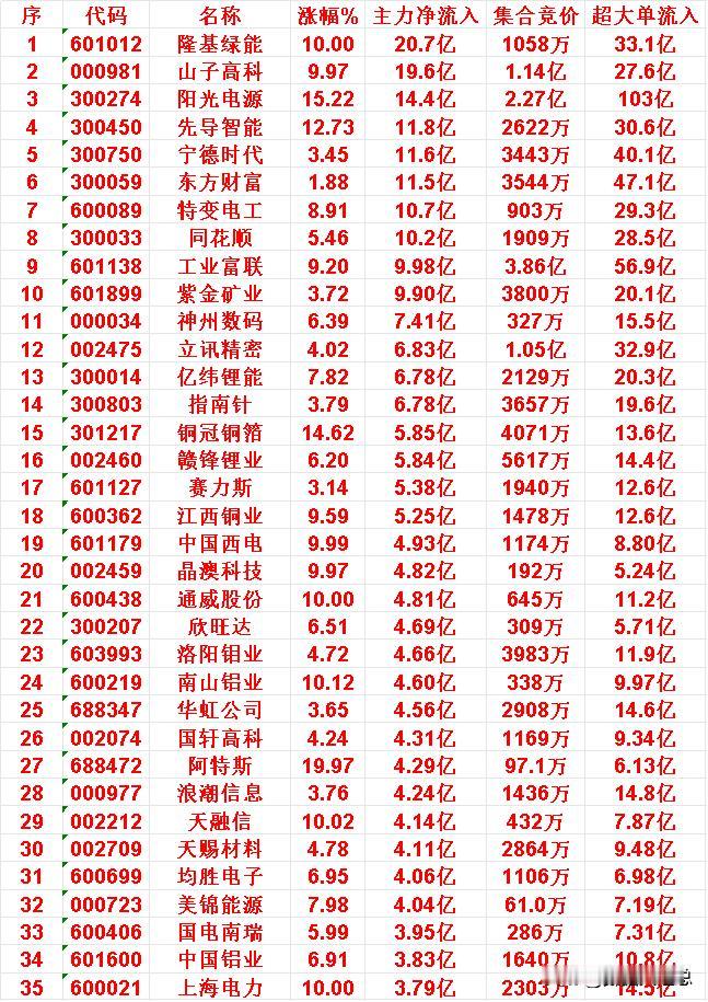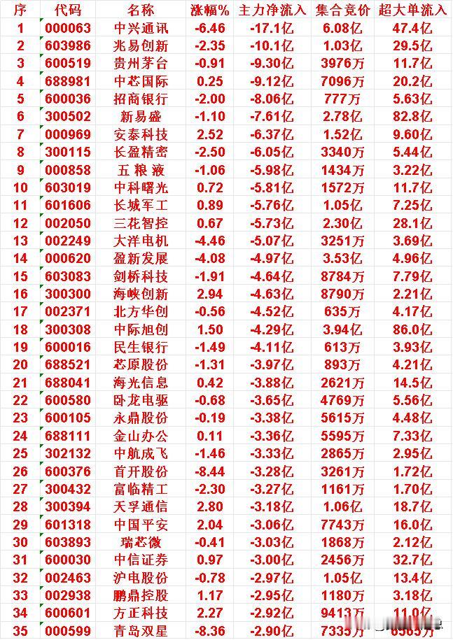 10月29日收盘,主力趁冲高,已经大幅卖出的35名单: 中兴通讯:主力净流出 17.1亿元 兆易创新:主力净流出 10.1亿元 贵州茅台:主力净流出 9.30亿元 中芯国际:主力净流出 9.12亿元 招商银行:主力净流出 8.06亿元 新易盛:主力净流出 7.61亿元 安泰科技:主力净流出 6.37亿元 长盈精密:主力净流出 6.05亿元 10月29日收盘,主力资金“大幅买入”的35强: 天齐锂业:主力净流入 11.9亿元 江特电机:主力净流入 7.77亿元 天际股份:主力净流入 6.12亿元 中微公司:主力净流入 5.57亿元 华友钴业:主力净流入 5.12亿元 同方股份:主力净流入 4.38亿元 美年健康:主力净流入 4.18亿元 鹏辉能源:主力净流入 4.03亿元 富士达:主力净流入 3.96亿元 紫金矿业:主力净流入 3.92亿元 永兴材料:主力净流入 3.60亿元 中国卫星:主力净流入 3.55亿元 亿纬锂能:主力净流入 3.54亿元 浙江东方:主力净流入 3.51亿元 康盛股份:主力净流入 3.44亿元 赣锋锂业:主力净流入 3.43亿元