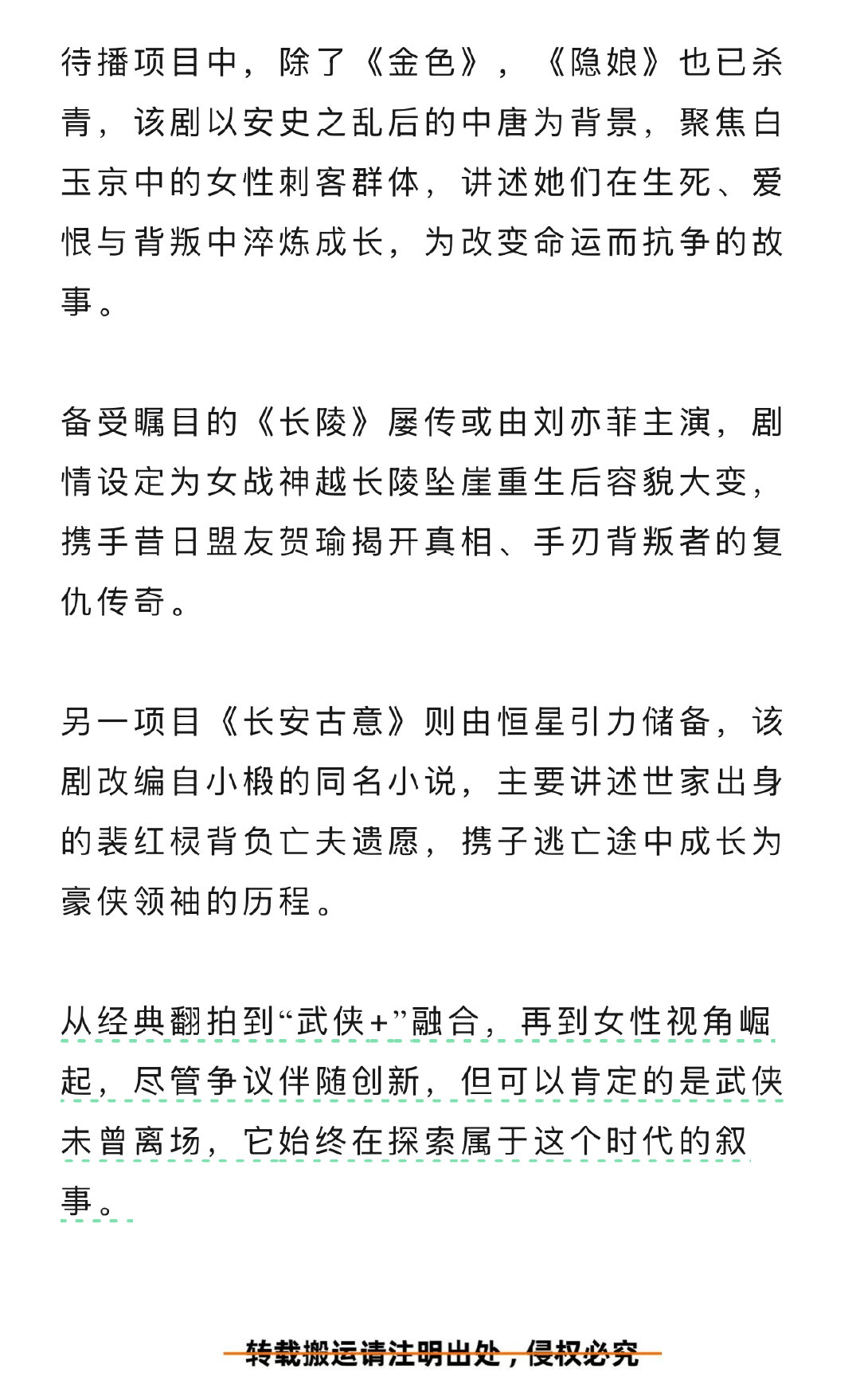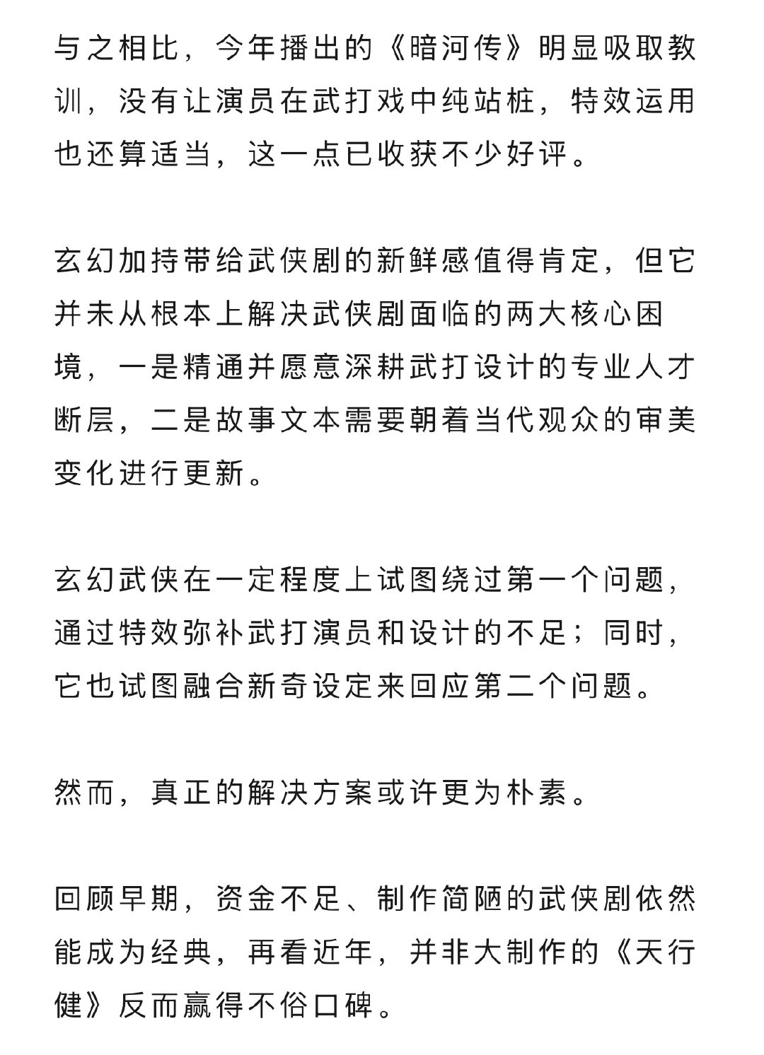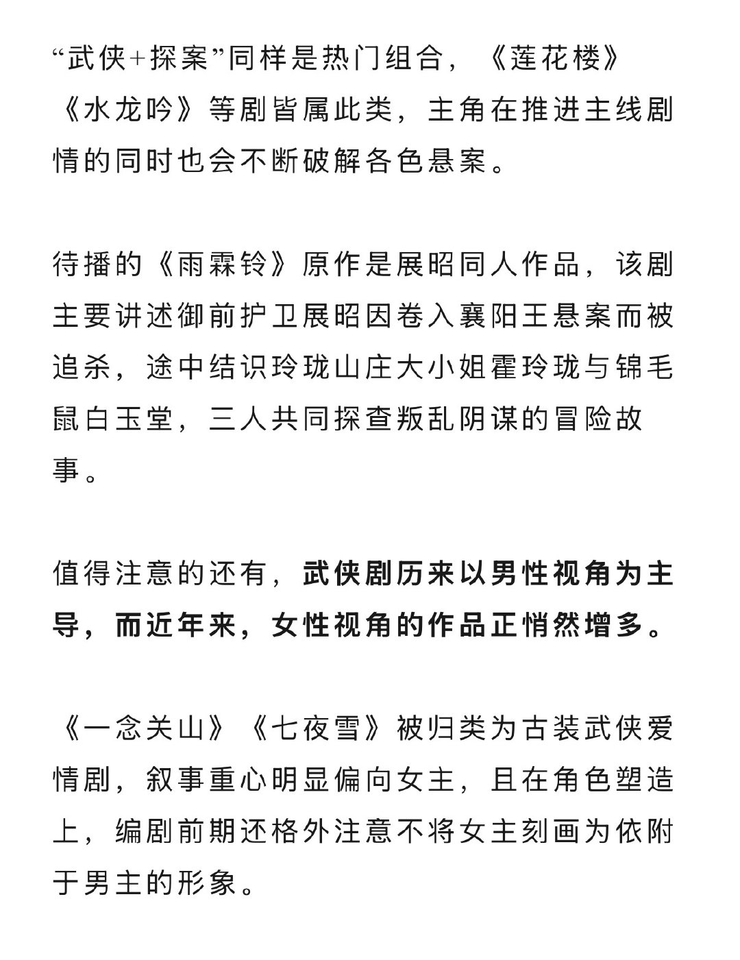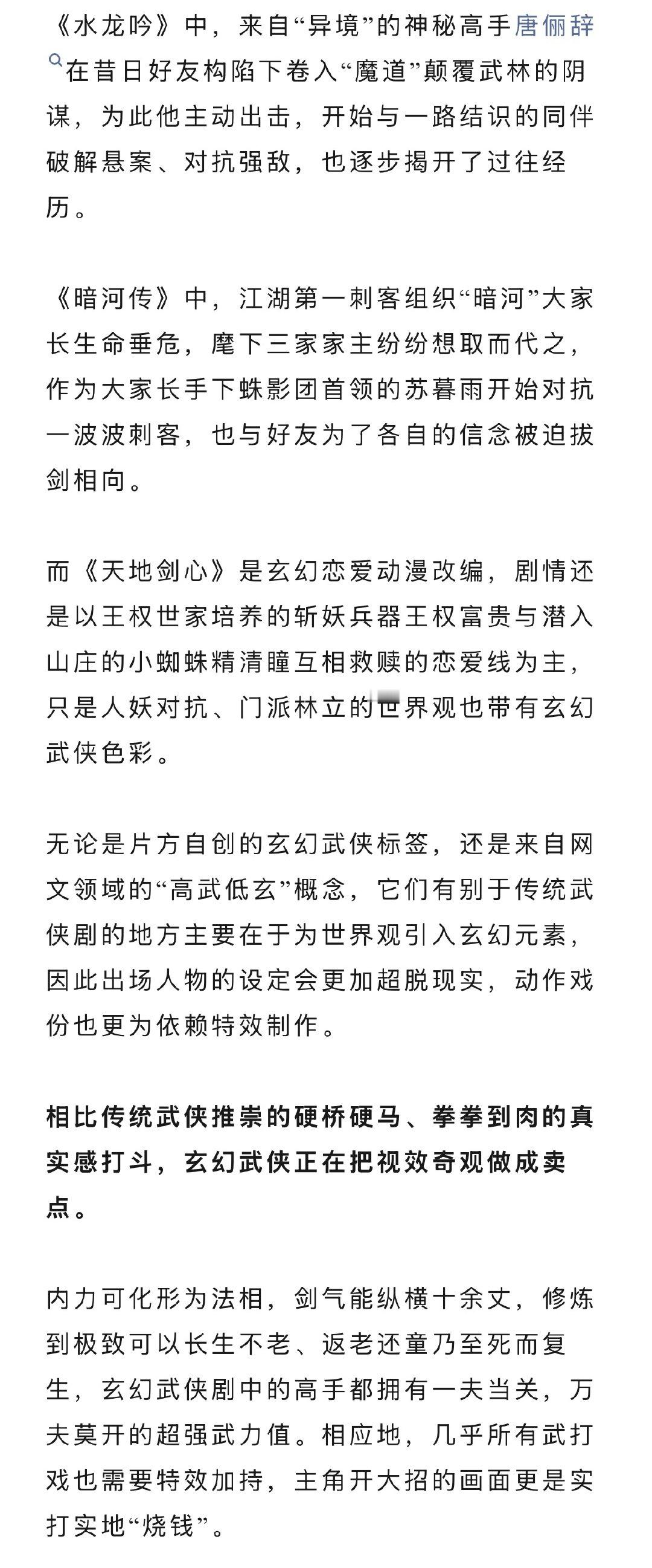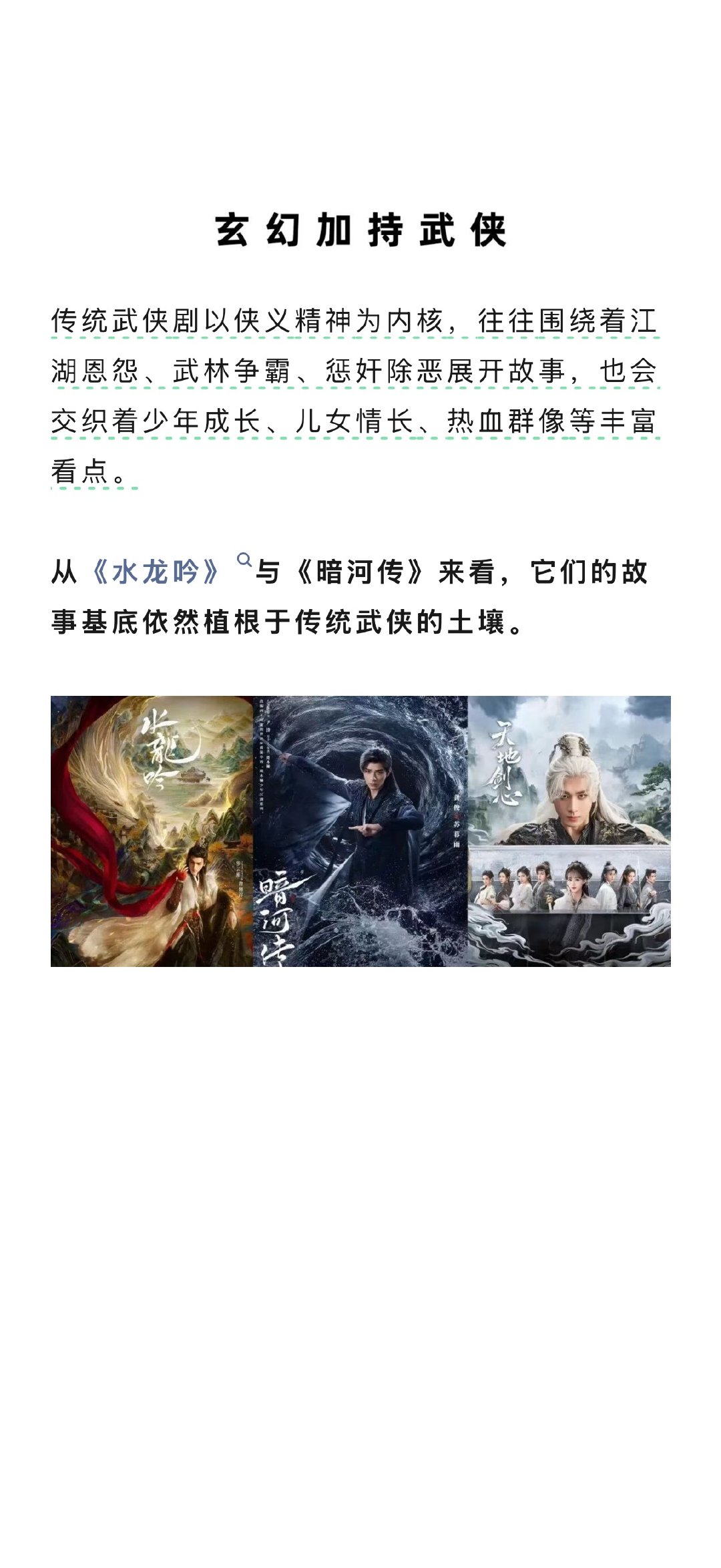 水龙吟暗河传天地剑心谁能破局 《水龙吟》自创“玄侠”世界观、《暗河传》引入“高武低玄”概念、《天地剑心》融合玄幻、恋爱与武侠元素,玄幻武侠剧似乎正在崛起。相比传统武侠剧,这类作品在叙事格局和视觉呈现上都展现出更为开阔的想象力,为类型创作带来了新鲜气息。