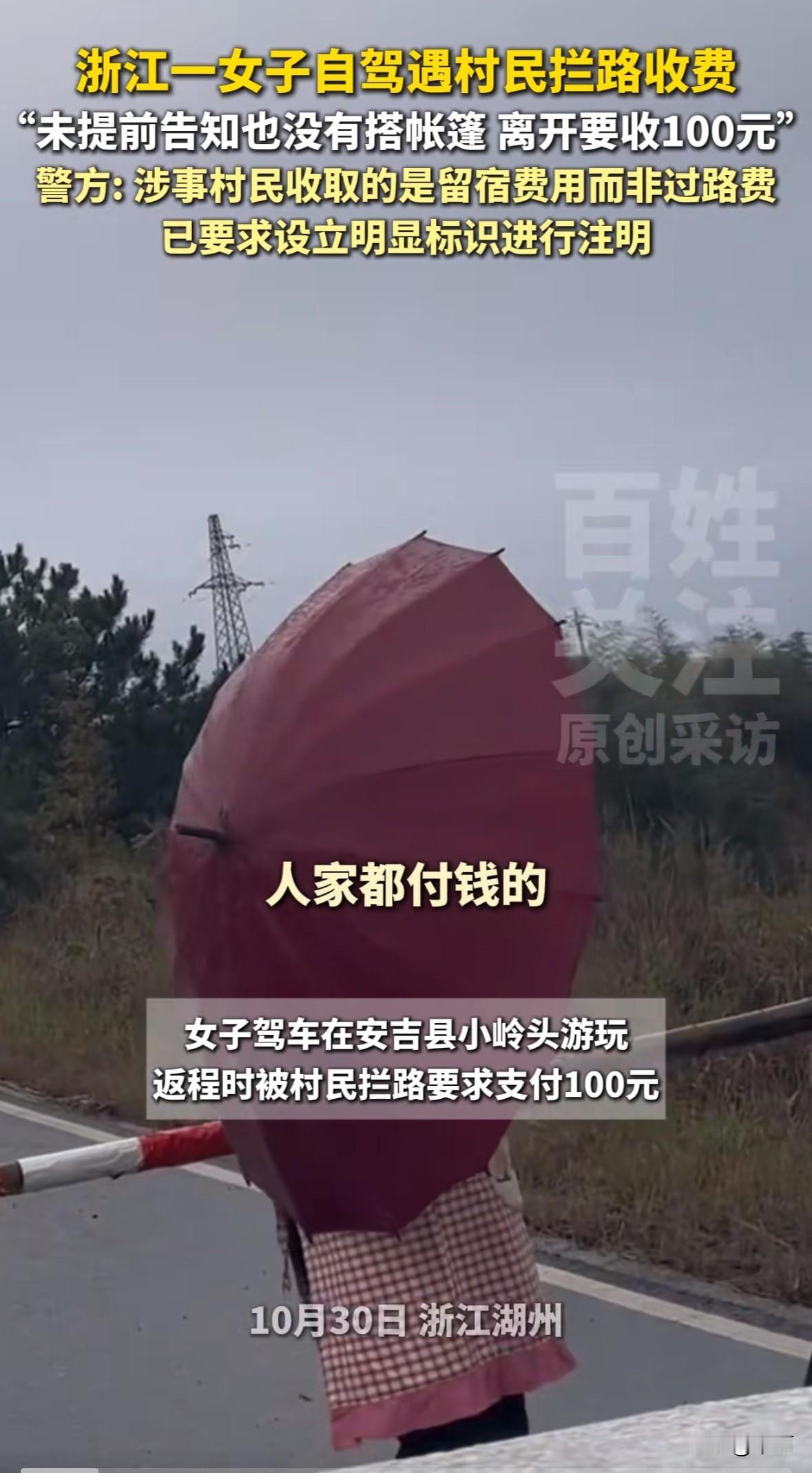 浙江湖州安吉县天荒坪小岭头,一女子自驾游玩返程时,被村民拦路要100元。女子说进村没见收费提示,也没露营,不该给,村民却称“拦车不犯法”。报警后调解,女子付50元才走。 派出所回应,收的是村民自家土地相关费用,算留宿费,此前多次接反映,已要求设收费标识,后续还会沟通。 这事儿看得人纳闷。私人土地收费得提前说清吧,返程才拦路要钱,任谁都难接受。乡村要吸引游客,得明码标价讲规矩。光靠民警调解治标不治本,真把收费标准、范围标清楚,才能避免矛盾,不然只会败了游客的好感。