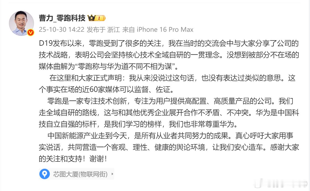我在当时的交流会中与大家分享了公司的技术战略,表明公司会坚持核心技术全域自研的一贯理念。没想到被部分不在场的媒体曲解为“零跑称与华为道不同不相为谋”。