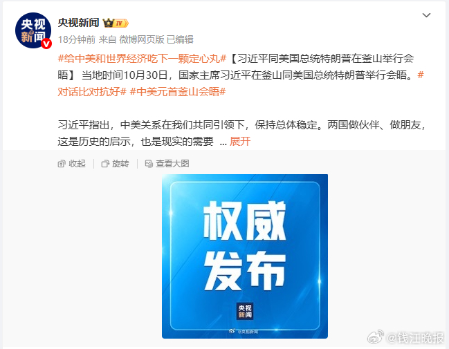 #给中美和世界经济吃下一颗定心丸#【习近平同美国总统特朗普在釜山举行会晤】 当地时间10月30日,国家主席习近平在釜山同美国总统特朗普举行会晤。#对话比对抗好# #中美元首釜山会晤#