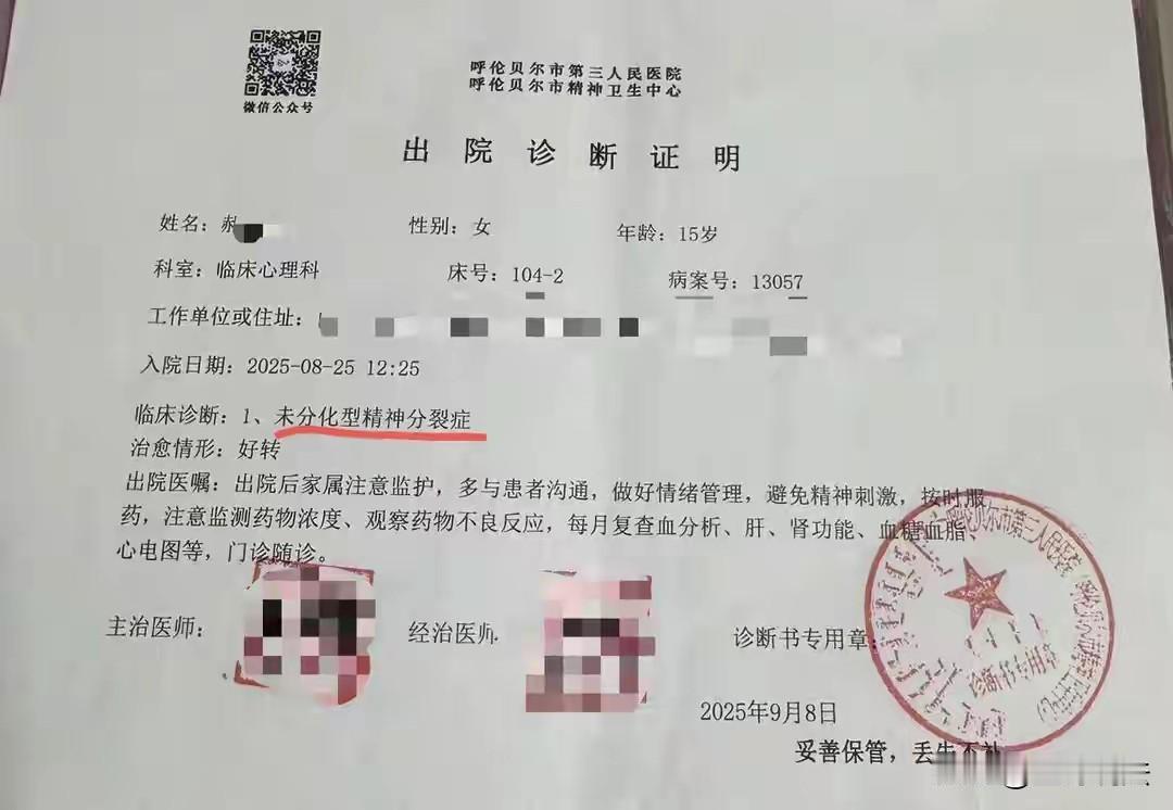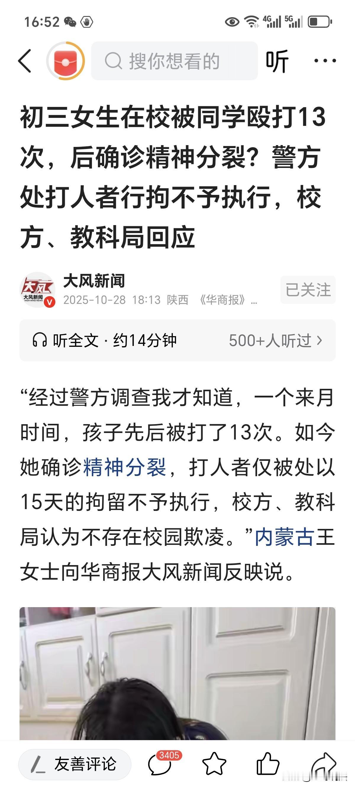 内蒙古,一女子发现,正上中学的女儿表情呆滞,白天不愿上学,晚上不愿睡觉,饭也不吃,还多次要钱,女子到学校一问,这才知道,一女同学问女儿要钱,不给就打,扇耳光,掐脖子,薅头发撞墙,女儿一次也没还手,副校长碰到也不管,女子报警,警方调出监控,女子这才发现,女儿被同学欧打13次,警方做出处罚,对涉事人拘留15日,罚款1000元,但因打人者未满16周岁,不予执行,女子心在滴血,到学校理论,但学校的态度更令人心寒! 王女士气愤难当,她告诉记者,女儿马上就要中考,可最近却发生了异常,她到学校一查,女儿竟然被同学打了13次! 原来,王女士的女儿小郝出生于2009年,女儿乖巧懂事,是父母心里的宝贝。 2022年,小郝考入了额尔古纳市某中学,但小郝的成绩,一直不太理想。 女儿虽然成绩不好,可她不会惹事,也不会调皮捣蛋,王女士对女儿并没有过多的要求, 2025年的时候,小郝已经临近中考,到了6月10日前后,小郝的状态引起王女士的注意。 王女士发现,小郝最近表情呆滞,她不思饮食,不愿意去学校上课。 到了晚上,小郝休息不好,她辗转反侧,就是睡不着觉。 王女士问女儿咋了,是不是遇到了什么难事,可女儿一句话不说,王女士心里有些急了。 6月19日,王女士向老师反映情况,可王女士没有得到答复 王女士还发现,6月初到20号日左右,女儿总是回来要钱,每次都要三五十块。 6月19日这天,女儿编了个牵强的理由,问自己的小姨要了600块钱。 小姨心里奇怪,这孩子从未有过这样,小姨要一探究竟,这事肯定会有原因。 6月20日,小姨来到了小郝的学校,谁知她一问,一位同学告诉小姨,小郝被女同学高某长期殴打,小郝已经被高某给打怕了。 小姨赶忙通知了王女士,王女士追问小郝事情的原委,小郝这才将事情真相告诉妈妈, 小郝告诉她说,她之所以要钱,是给同学高某,高某问她要钱,不给就会打她。 小郝说她被高某殴 打了多次,高某薅住她的头发,把她往墙上撞去,还对她扇耳光,连打带骂,拳打脚踢。 6月21日晚上,王女士联系班主任李某,第二天上午,王女士和丈夫、妹妹来到女儿学校。 他们要求查看监控视频,可老师要他们去找学校领导,王女士报警,警方赶来,这才调取到了学校里的监控录像。 可他们只看到了6月20日的视频,视频里高某大概是没有考好,小郝去安 慰她,还没开口,高某直接扇了她两个耳光。 王女士要看其他时段的视频,学校拒绝,女儿告诉王女士说,高某曾威胁她说,如果不和高某玩,高某就会打她。 一位同学告诉王女士,高某经常打小郝,还不让小郝和别人玩。 小郝不敢还手,这学期每周都会被高某打好几次…… 高某不但殴打小郝,还撕小郝的书和卷子,当着同学的面又打又骂,同学告诉学校领导,但是也没啥用。 6月23日,王女士要看完整视频,学校拒绝,王女士再次报案,警方立案侦查。 警方调查发现,5月7日~6月20日期间,小郝被高某打了13次。 监控里显示,高某对小郝扇耳光,掐脖子等,连推带搡,小郝一次都没还手,副校长路过看见,竟然不加制止。 王女士痛哭不止,这是能看到的,还有很多没查出来的,她不知道女儿被打了多少次了。 警方查明,高某15岁,殴打小郝13次,高某家长提出,愿意补偿小郝50000元,与王女士和解。 王女士拒绝,希望高某能得到相应的处罚。 警方做出行政处罚决定: 拘留15日,罚款1000元。 但高某未满16岁,不予执行拘留,王女士对此不能接受。 之后,校长被诫勉谈话,副校长警告处分,班主任警告处分,调离班主任岗位。 可是小郝受到的伤害还在继续,她表情呆滞,说胡话,她大声喊道:别打我,我害怕…… 8月25日,王女士筹了20000元带小郝就医,小郝被诊断为未分化型精 神 分裂症。 医生认为,小郝可能因在学校受惊吓所致,这个病很难治愈。 王女士大哭,2022年的时候,女儿曾因为借宿在亲戚家中,患上了轻度抑郁症。 但女儿经过治疗已经痊愈,因此王女士认为,小郝的病情,和校园欺凌脱不了干系。 但校方认为,小郝和高某是好朋友,经常在一起,很难界定谁欺负谁。 学校和教育部门表示,小郝的事情不属于学校欺凌,责任如何划分应该由法院判定,他们会帮助小郝积极治疗。 《民法典》1188条规定: 无民事行为能力人、限制民事行为能力人造成他人损害的,由监护人承担侵权责任。 高某因未满16岁,其监护人需承担民事赔偿责任。 《民法典》第1200条规定: 限制民事行为能力人在学校或者其他教育机构学习、生活期间受到人身损害,学校或者其他教育机构未尽到教育、管理职责的,应当承担侵权责任。 小郝在学校遭受殴打,副校长路过未制止,班主任未及时发现异常,校方拒绝提供完整监控,且欺凌认定未通知监护人参与,属于管理失职。 校方需根据过错程度,承担相应的补充赔偿责任。