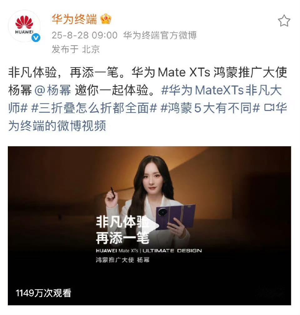 从去年官宣的“鸿蒙智行享界S9品牌挚友”升级成“享界品牌大使”!卡点8:51,今年华为旗下的顶配三折叠手机也给杨幂升级了title!可见和幂姐的合作是非常满意,代言里好像最难拿的就是汽车代言,汽车代言里考察是最严格的除了几个一线大牌,就非属华为汽车了,杨幂车代手机都升title了,今年官宣了这么多代言,都是最高的待遇,[捂嘴哭][捂嘴哭]