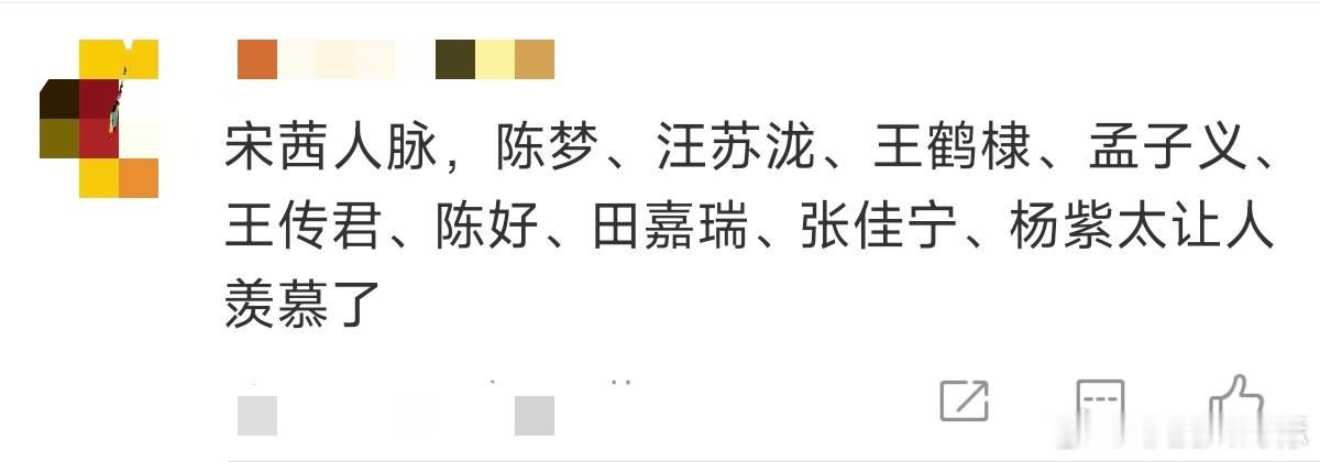 宋茜人脉 宋茜微博转发区谁还没被宋茜的“神奇社交圈”惊到?熟悉的好友里有陈好、田嘉瑞、张佳宁常伴左右,桃花坞综艺里又攒下汪苏泷、王鹤棣、孟子义、王传君这群欢乐搭子,连“蒋欣”的趣味互动都让人笑不活!更惊喜的是,从歌手、演员到奥运冠军陈梦都有交集,就连杨紫、张宥昊的相识都透着意外感~这么有魅力的她,今晚《山河枕》开播必须蹲守,看她在剧中的精彩表现!剧综大咖开放麦