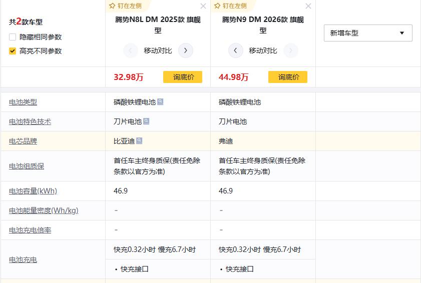 腾势N8L和腾势N9,两台车电池是一样的,都是46度电,查了一次啊工信部的纯电续