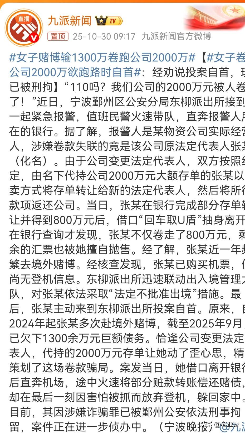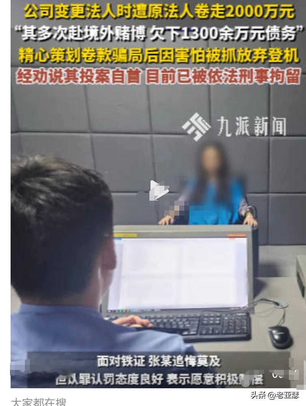 人生有两个恶习不能碰,一个是毒品,另一个就是赌博。 10月30日,在网上看到这么一个事情,女子赌博输1300万卷跑公司2000万。 竟然赌博输了1000多万,这真的是太疯狂了。 可见赌博的危害性是多么的巨大。 卷跑公司2000万,想逃到国外去,还没登机就怕了。 最终投案自首。