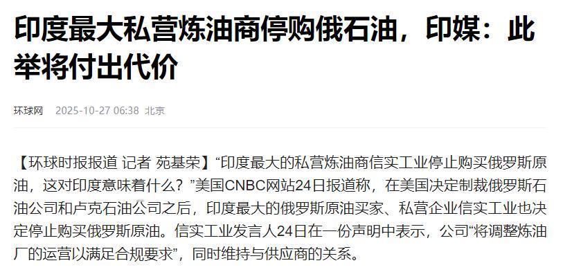 印度企业终究是扛不住压力,选择妥协了!   美国CNBC网站本月24日的报道称,自从美国宣布要制裁俄罗斯石油公司和卢克石油公司后,作为印度买俄罗斯原油最多的私营企业,信实工业直接表态不再买俄罗斯原油了。   信实工业在印度能源界那可是顶梁柱级别的存在,之前跟俄罗斯原油的合作打得火热。过去两年里,俄罗斯原油在它进口的所有原油里占了三成还多,旗下好几家大型炼油厂都指着俄罗斯原油过日子。   俄罗斯原油对于印度来说一直有价格优势,比国际上公认的基准油价便宜不少,信实工业靠买这种原油,不光把炼油的成本压了下来,炼出来的汽油、柴油在市场上也卖得更划算,竞争力特别强。   可美国这制裁一来,就像给这笔生意泼了盆冷水,交易风险一下子就上去了,这也成了信实工业不得不停手的直接原因。   这次美国的制裁专门盯着俄罗斯能源企业的“钱袋子”,不管是融资还是国际上的交易结算都给卡得死死的。要是哪个企业还敢跟被制裁的俄罗斯公司做生意,就可能被“连坐”,遭到次级制裁。   信实工业的生意遍布全球,在国际上要融资、要跟其他国家的企业合作,美元结算更是离不开。要是因为买俄罗斯原油触发了美国制裁,它在海外的工厂、合作项目,甚至连正常的资金往来都得受影响,这么大的风险摆在面前,信实工业根本不敢赌。   而信实工业这一停手,却让印度媒体都急了,纷纷说这事儿肯定要让印度付出代价。   不买俄罗斯原油了,信实工业就得赶紧找其他产油国买油,可国际上其他地方的原油价格大多比俄罗斯的贵,炼油成本一涨,最后加油站的油价、老百姓用的各种能源产品价格都可能跟着涨,普通民众的生活成本就得往上走。   而另一方面,印度这些年一直想多找几个地方买油,让能源供应更稳当,俄罗斯原油本来是其中很靠谱的一环,现在断了这条线,能源供应的不确定性就增加了,对整个国家的能源安全布局也得重新调整。   说到底,信实工业的妥协就是被国际制裁逼得没办法。这事儿不光能看出美国制裁对全球能源买卖的影响有多大,也暴露了印度企业在国际政治经济的博弈里,往往得看别人脸色的被动处境。   接下来,印度政府和企业得好好琢磨琢磨,怎么才能既保证能源够⽤、成本不太高,又能应对各种外部压力,这可不是件容易事儿,得长期慢慢想办法。