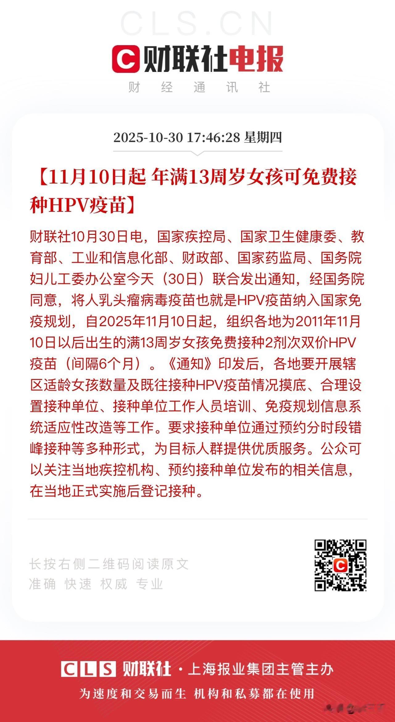 福音! 11月10日起, 年满13周岁女孩可免费接种HPV疫苗。 HPV是人乳头瘤病毒, 是宫颈癌的主要致病机理。 近些年宫颈癌、乳腺癌呈现高发性、年轻化, 三千家人就是这样的不幸,哎! HPV现在技术成熟、市场供应充足, 原先是默沙东垄断。 A股HPV公司: 万泰生物二价、九价HPV疫苗, 沃森生物二价HPV疫苗, 智飞生物代理默沙东四价、九价HPV疫苗, 成大生物研发十五价等更高阶疫苗。 二价现在是白菜价。 早些年为了打HPV疫苗, 国内居民不惜花费高额费用到香港注射。 科技进步和经济发展, 真的是能惠及普罗大众! …