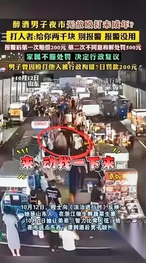 弟弟送货被打!原因竟是… 醉酒男为啥冲智力障碍者动手?监控画面看得人揪心!山东大姐程姐在浙江带弟卖菜,弟弟因幼时意外智力停在3岁,平时只负责送菜到饭店。可那晚,弟弟刚放下菜就被一醉汉踢倒,拽到角落拳打脚踢!连拉架大哥都被扇巴掌,醉汉还狂言"报警也没用"。 咱就说,醉酒能当免罪金牌吗?警方只罚500不拘留,程姐当场怒了:"他打小孩似的欺负残疾人,凭啥轻饶?"网友也炸锅:"酒品见人品,打弱势群体算什么本事?必须拘留+赔偿!" 欺负残疾人还拿酒说事,这不是 coward 是什么?酒精不该成为恶行遮羞布,法律更该为弱者撑腰。醉酒不是免责理由,对霸凌就得零容忍! 您觉得醉酒该从轻处罚吗?来评论区聊聊!
