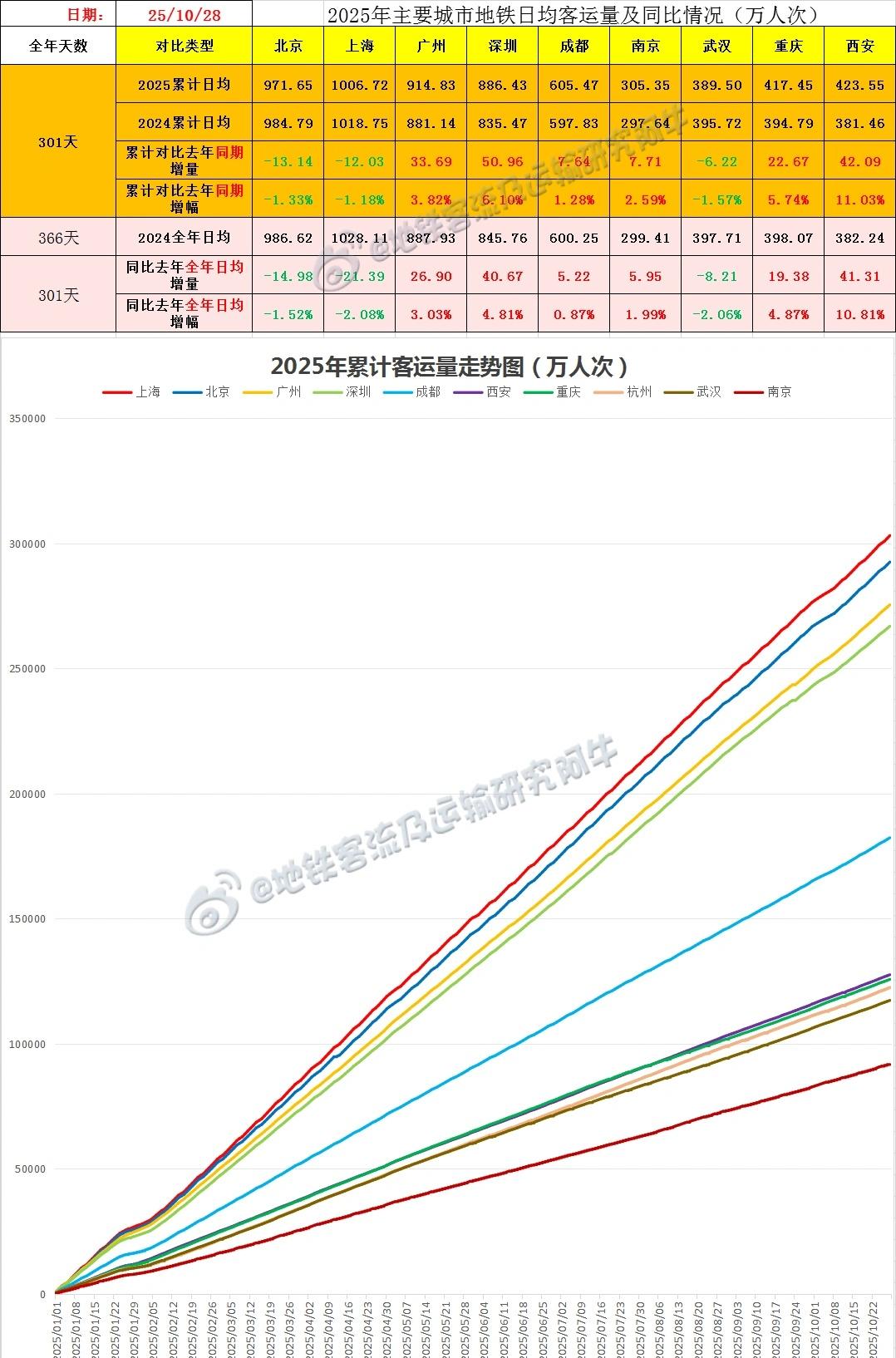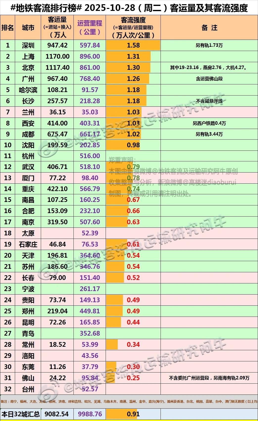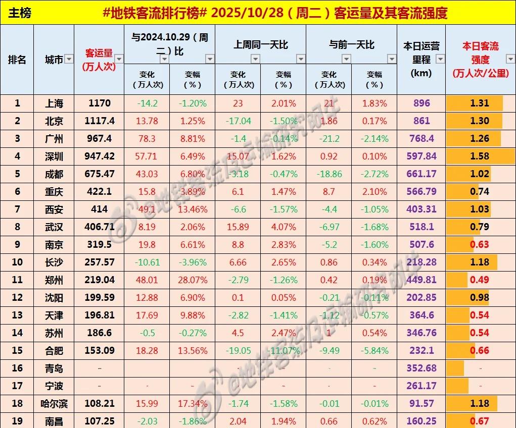 【中国城市地铁客流排行榜 2025-10-28(周二,农历九月初八,中国地铁客流日报】 上海1170万, 北京1117.40万(其中19-23.16,燕房2.76,大机4.27), 广州967.4万, 深圳947.42万(另有轨1.73万), 成都675.47万(另有轨3.44万), ……余见下表(1-客运量排序,2-客流强度排序)