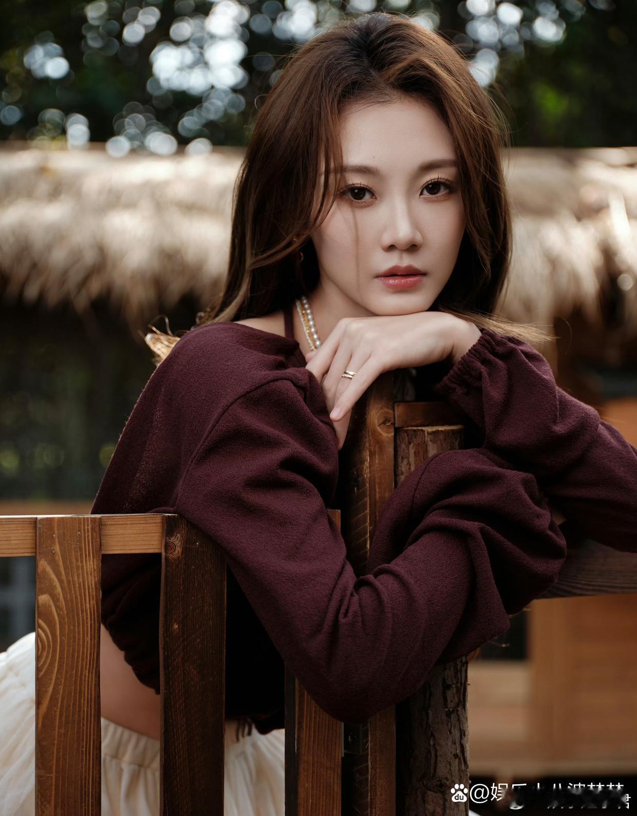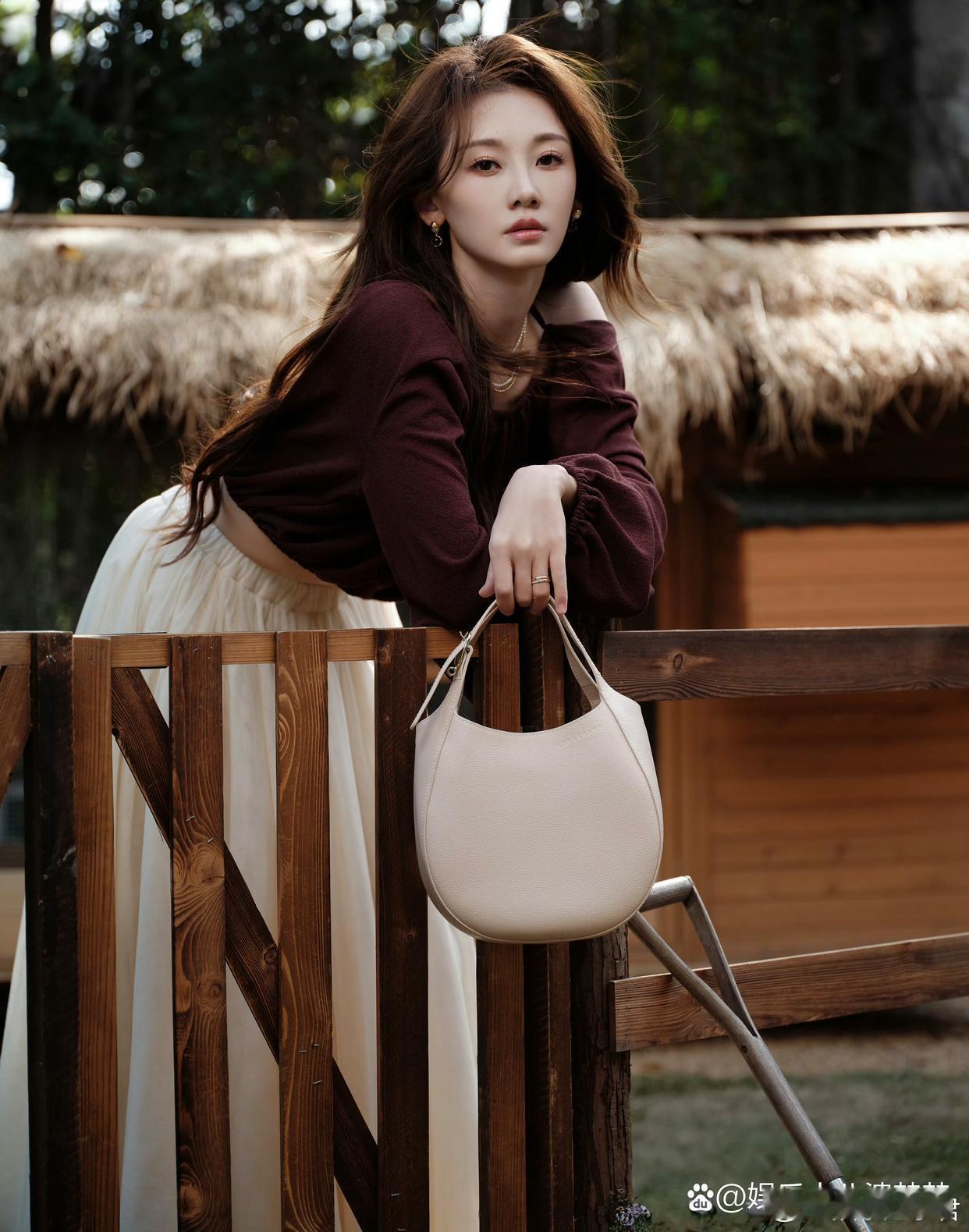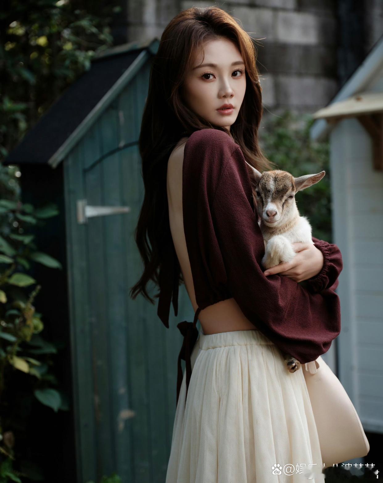 苗苗身着酒红色露背装搭配米白色纱裙,将自家花园草田变成时尚秀场,在与动物和自然的亲密接触间,展现着秋日时尚的独特松弛感🍂