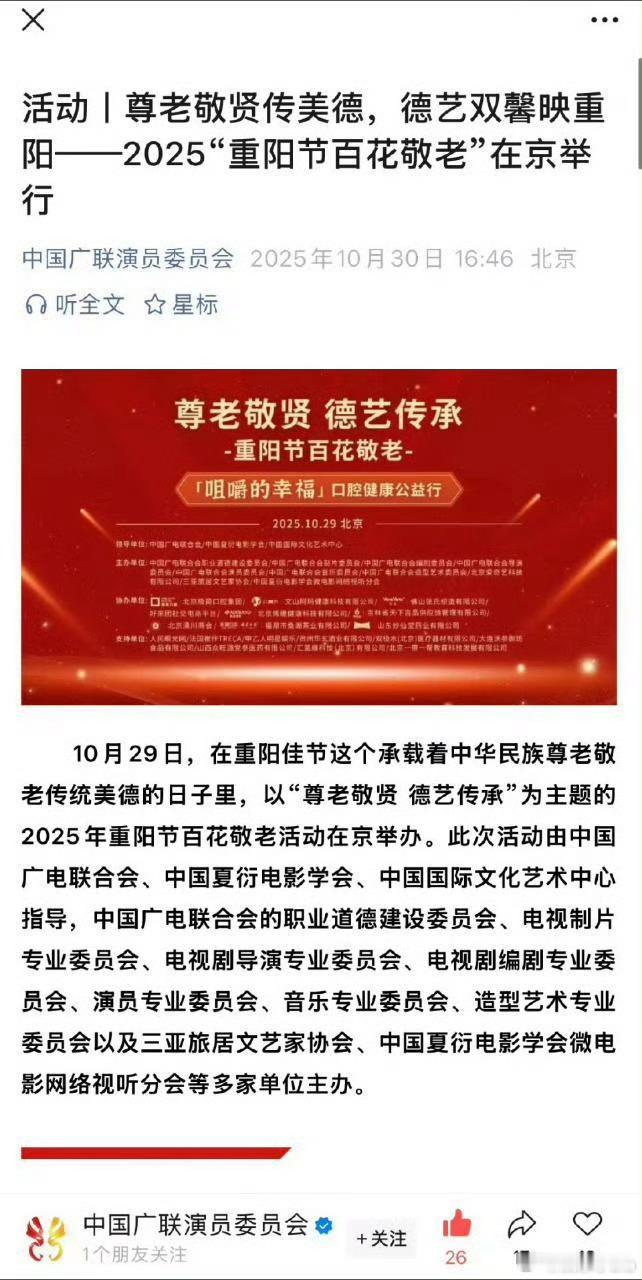 中国广联演员委员会举行的「重阳节百花敬老」活动特地提到了Angelababy ,受到官方认可!