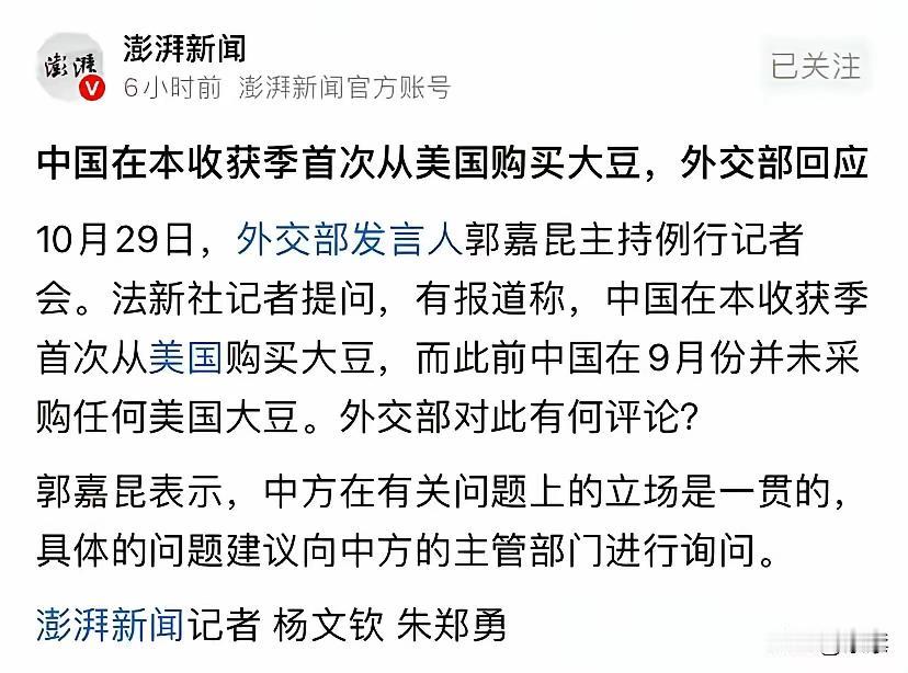 巴西傻眼了!中国突然宣布恢复采购美国大豆,双方趋势缓和;巴西豆农之前不断给中国涨价,终于品尝恶果! 最新消息:10月29日媒体透露,中国最近购买了三船美国大豆,预定在12月至2026年1月装船,一共18万吨。这是2025-26年美国大豆销售年度,中国首次购买美国大豆。这个估计最不开心的就是巴西!他们太郁闷了! 此前,巴西豆农仗着自身在大豆出口上的一定优势,不断给出口到中国的大豆涨价,以为中国会一直买单。他们没有料到,中国市场有着强大的灵活性和多元的选择。 网友:巴西大豆涨价的原因,除了大国‘集采’,不知道是否有供给失衡的因素,现在转向美国采豆,一方面是谈判所需,也许有巴西供不应求的隐性压力。 已经给巴西机会了,就看巴西抓不住得住。美豆仅仅定了18万吨,而且还是12-1月装船,还有11月1个多月时间,如果价格回归以前,估计中国会在11月下单很大量的巴西豆,巴西如果价格还坚挺就是自找了。 遵从市场价值规律,打破一家独大是当代经济思维。美国,巴西,阿根廷等在大豆上除非是铁板一块哄抬物价,若不是,就得权衡利弊,真心实意与中国合情合理交易,互惠互利才有通途。 中国现在的确是不仅拿捏住了美国,连巴西这个想趁机抬高豆价、坑赚中国的也被拿捏住了。一句话 : 都垂涎中国这个大市场!