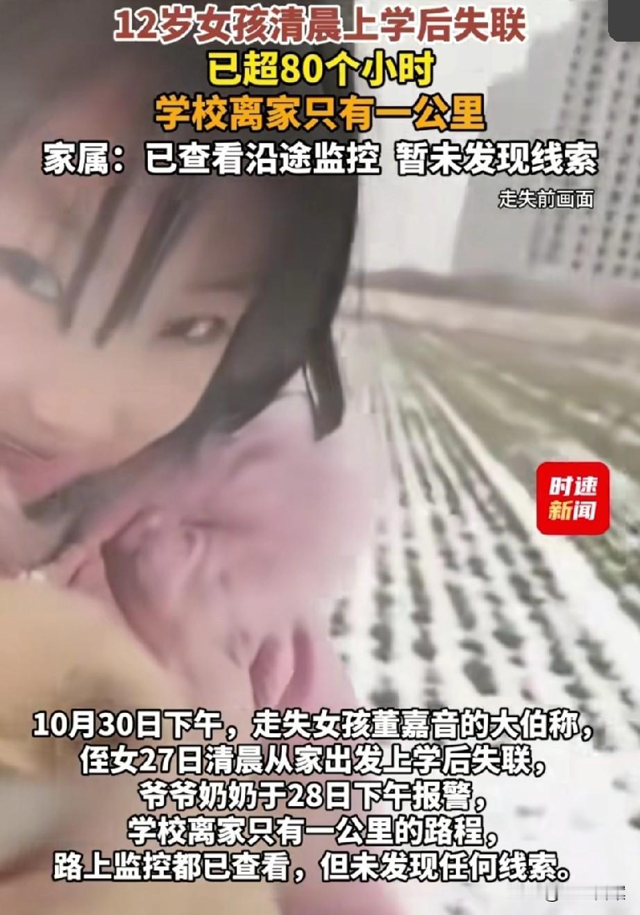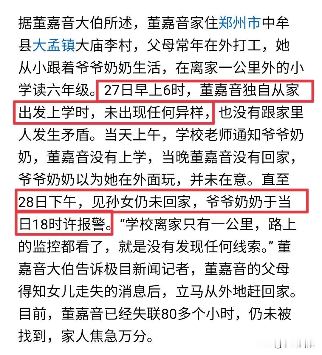 河南12岁女孩上学途中失联超3天,她是留守儿童,爷爷奶奶第二天才报警,整个失踪过程至少有5个可疑地方让人琢磨不透! 董嘉音是河南中牟县一小学六年级女生,父母常年在外务工,她留守在家,与爷爷奶奶共同生活。 10月27日清晨,她像往常一样从家里步行上学,没想到在途中失踪,到目前为止还音信全无。 细梳董嘉音的失踪过程,有5个疑点让人难以理解: 一、家离学校仅一公里,这条路嘉音每天上学必走,可谓是轻车熟路,这么近的距离,一个12岁的女生,是不可能自己迷路失踪的。 二、小学的上课时间,一般都是8点多,一公里的路程,十几二十分钟就能步行到达,可那天嘉音早上6点就从家里出发了,她干嘛要去那么早呢? 三、现如今监控那么发达,嘉音失踪后,路上所有监控都看了,没有任何线索,她是在哪里失踪的呢?为何摄像头没有拍下? 四、失踪前,嘉音一切情况正常,也没有和家人发生矛盾,离家出走的概率比较低,难道真是遇到了坏人?可对一个12岁的女生下手,动机又是什么? 五、老师发现孩子没来上课,立刻通知了嘉音的爷爷奶奶,可直到第二天晚上,老人家才报警寻找,理由是以为孙女贪玩,去朋友家玩耍了。是老两口老实本分,对周围人放心,还是孙女以前就有这种情况呢?为啥晚上不回家,他们也不担心? 孩子失踪的黄金时间就那么多,越早发现、越早寻找、越早报警,机会也就越大。 希望董嘉音真的只是出去玩了,这两天就能平安回家,与亲人团聚…… 【关注@小讼言案 ,为您分享更多精彩】 (来源:极目新闻)