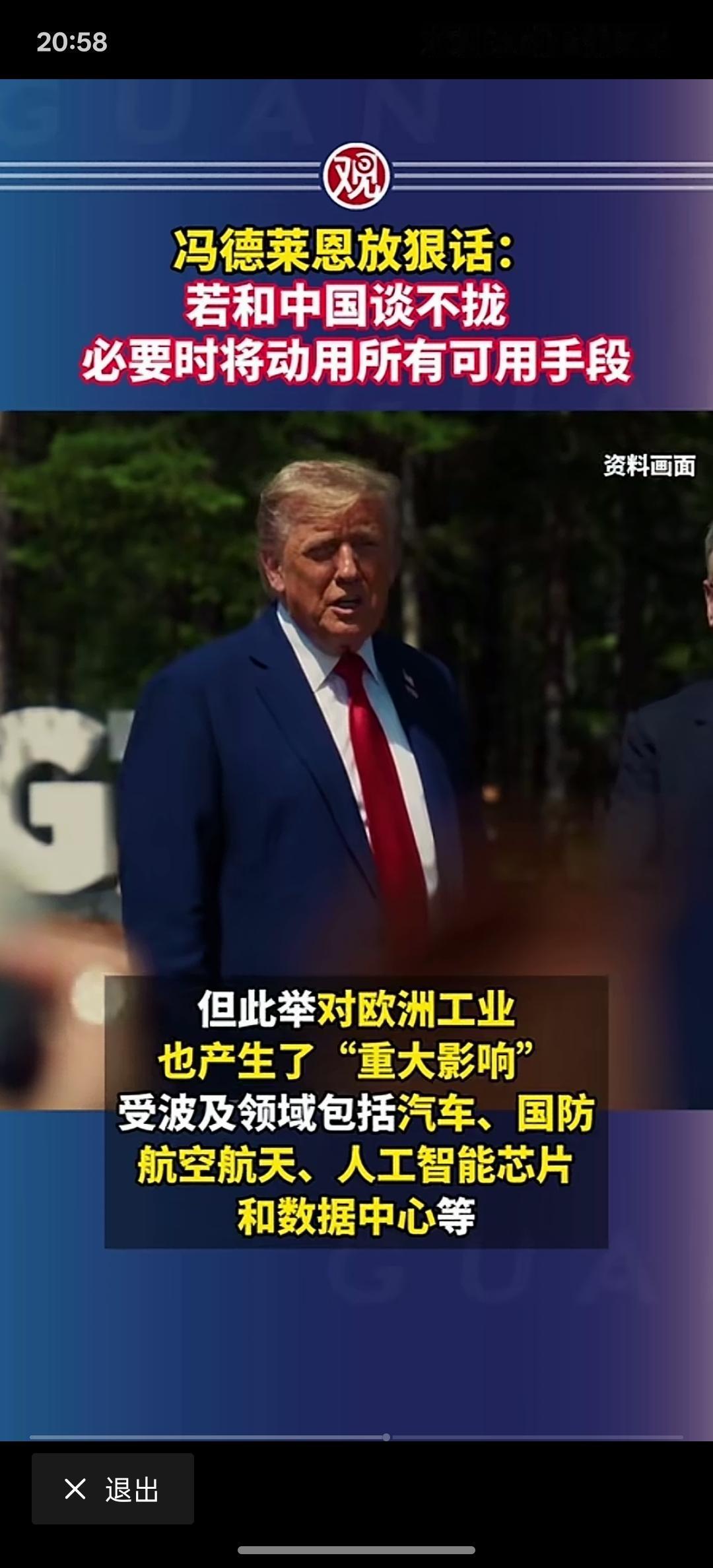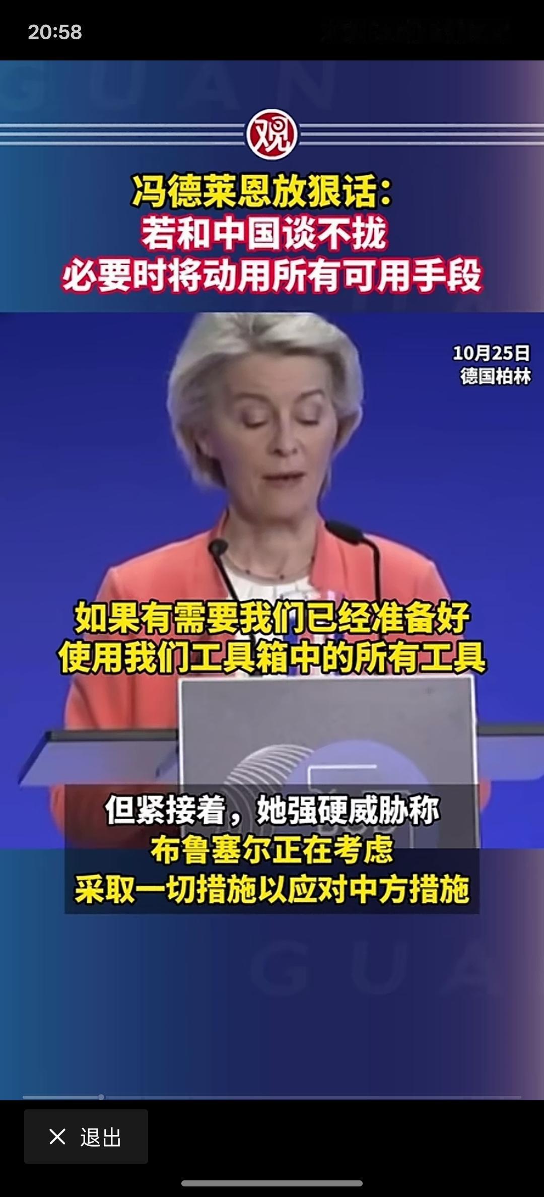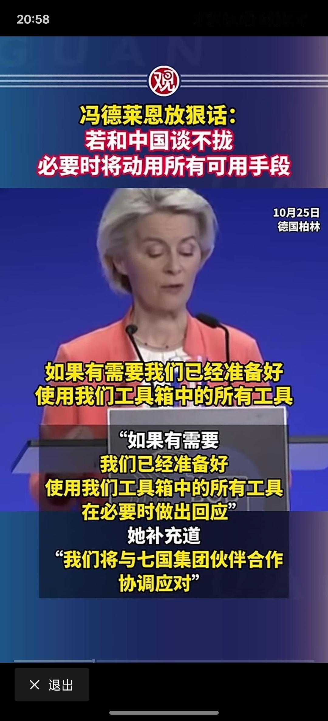 冯德莱恩,继续放狠话,如果和中国在系统问题上面谈不拢的话,如果有需要,欧盟会做好准备使用他们工具箱里的所有工具!不知道欧盟工具箱里面还有什么工具可以用!但是我敢肯定欧盟会吃不完中国又得兜着走!现在欧洲的汽车产业链开始停产,没有中国的稀土,欧洲的芯片要怎么生产?欧洲的汽车工业怎么生产?