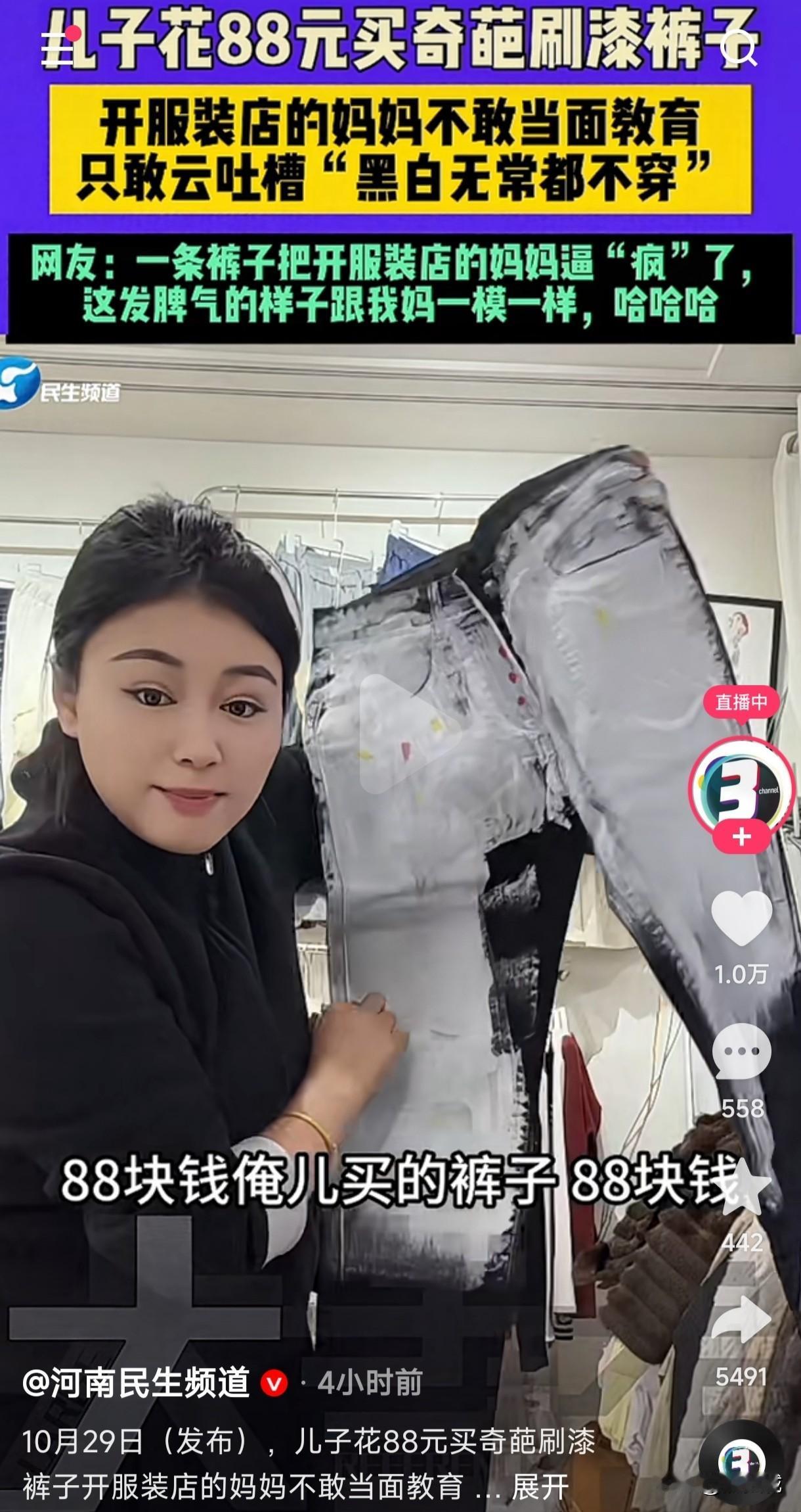 开服装店的妈妈发视频吐槽儿子花88元买奇葩刷漆裤子,黑白无常都不穿的居然让她儿子买来了,这到底是什么脑回路? 卖衣服的妈妈居然被买奇葩裤子的儿子给逼疯了,不敢当面批评教育,只能发视频在网上诉苦,看看究竟有多少母亲像她一样被自家孩子买那些奇葩衣服的操作让大人无法理解,视频发出后原来有不少的网友也是这样,深有共鸣的家长都很理解这位母亲的心情,无奈只能在网上吐槽一下,当面批评教育还就把掌上宝得罪了,这年头做父母的可谓是难上加难啊!