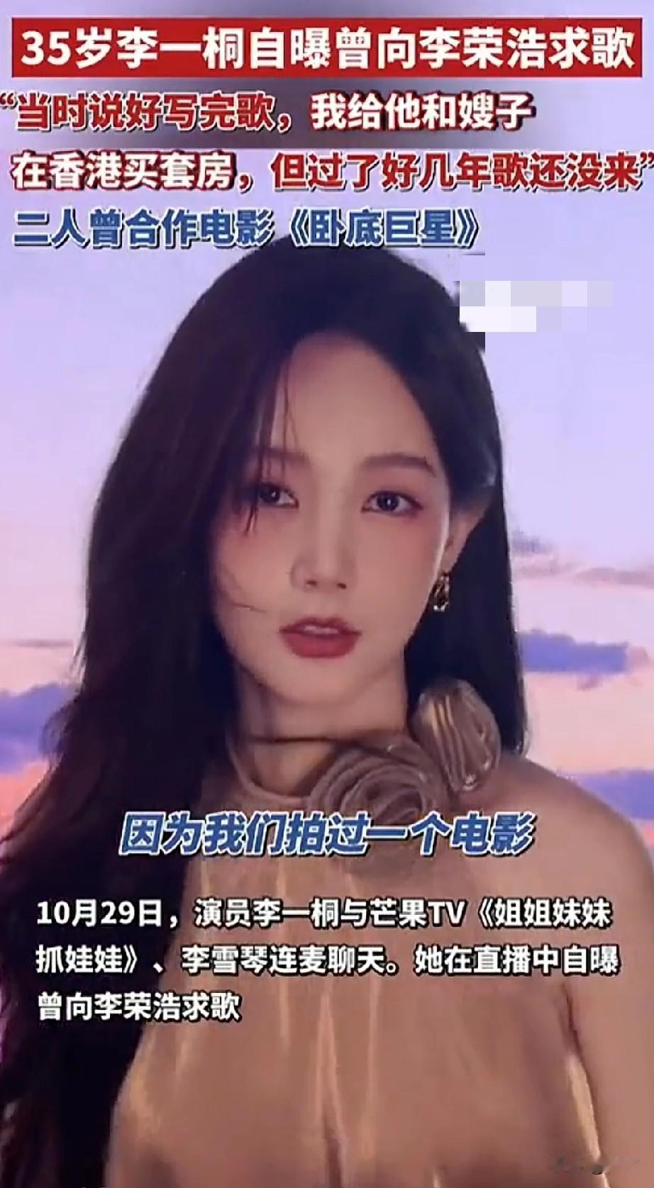 35岁李一桐自曝曾向李荣浩求歌, 当时说好写完哥, 我给她和嫂子在香港买套房, 但是过了好几年歌曲都没来, 二人曾合作过电影《卧底巨星》, 10月29号演员李一桐和李雪琴连麦聊天,在直播中自曝这件事情, 这是喊话李荣浩呀! 李荣浩听到了吗? 赶紧给人家写首歌吧! 这样就能在香港有套房, 以后去香港旅游来演唱会也有地方住了,住酒店哪有家里面舒服! 突然好了明星挣钱好容易, 随随便便就送别人房子, 怪不得那么多女生挤破头进娱乐圈! 大家对于李一桐自曝向李荣浩求歌怎么看? 娱乐圈那点儿事 娱乐圈每日热议 李一桐演技 李一桐艺术照 李一桐素颜 李一桐礼服造型