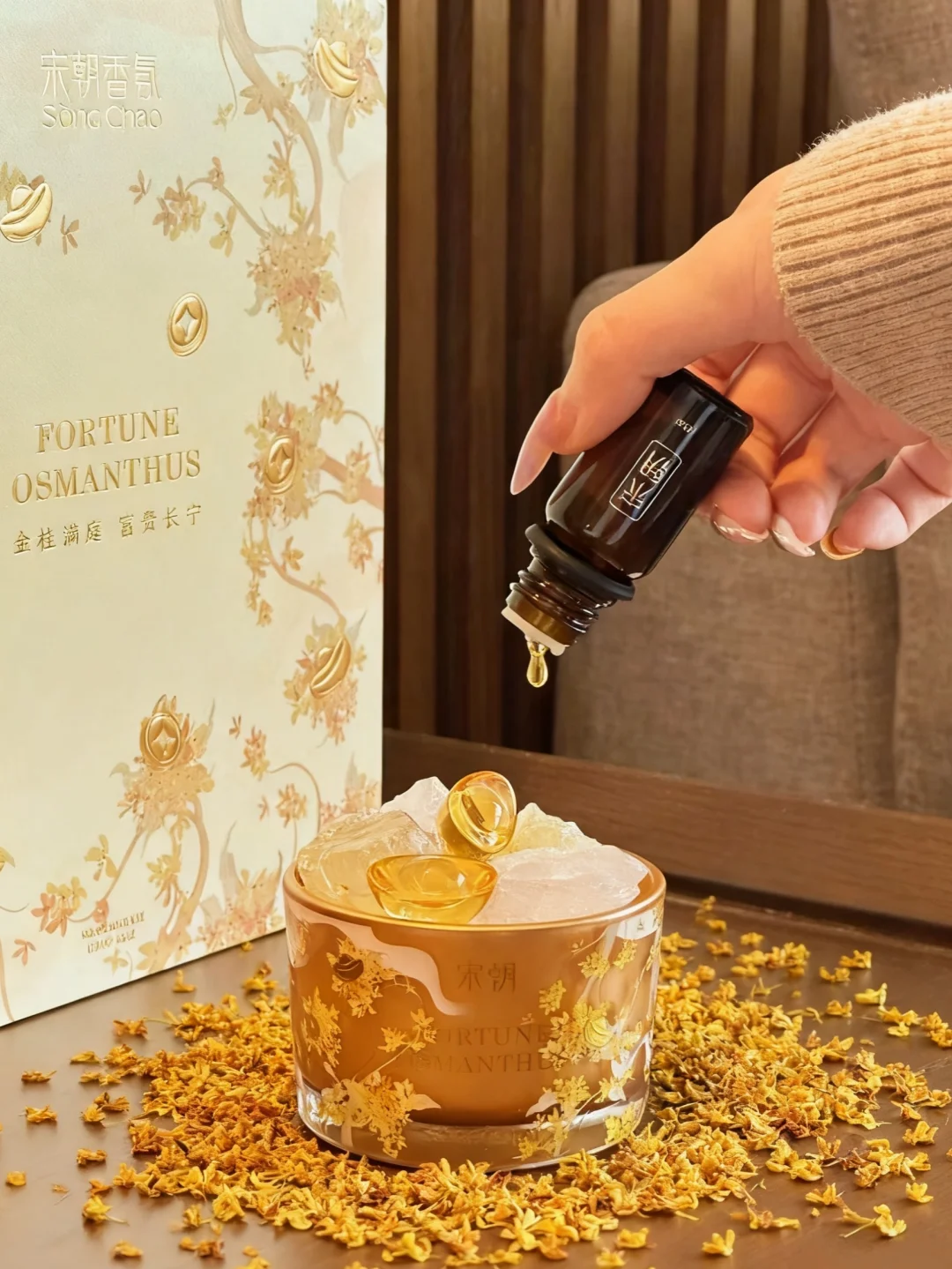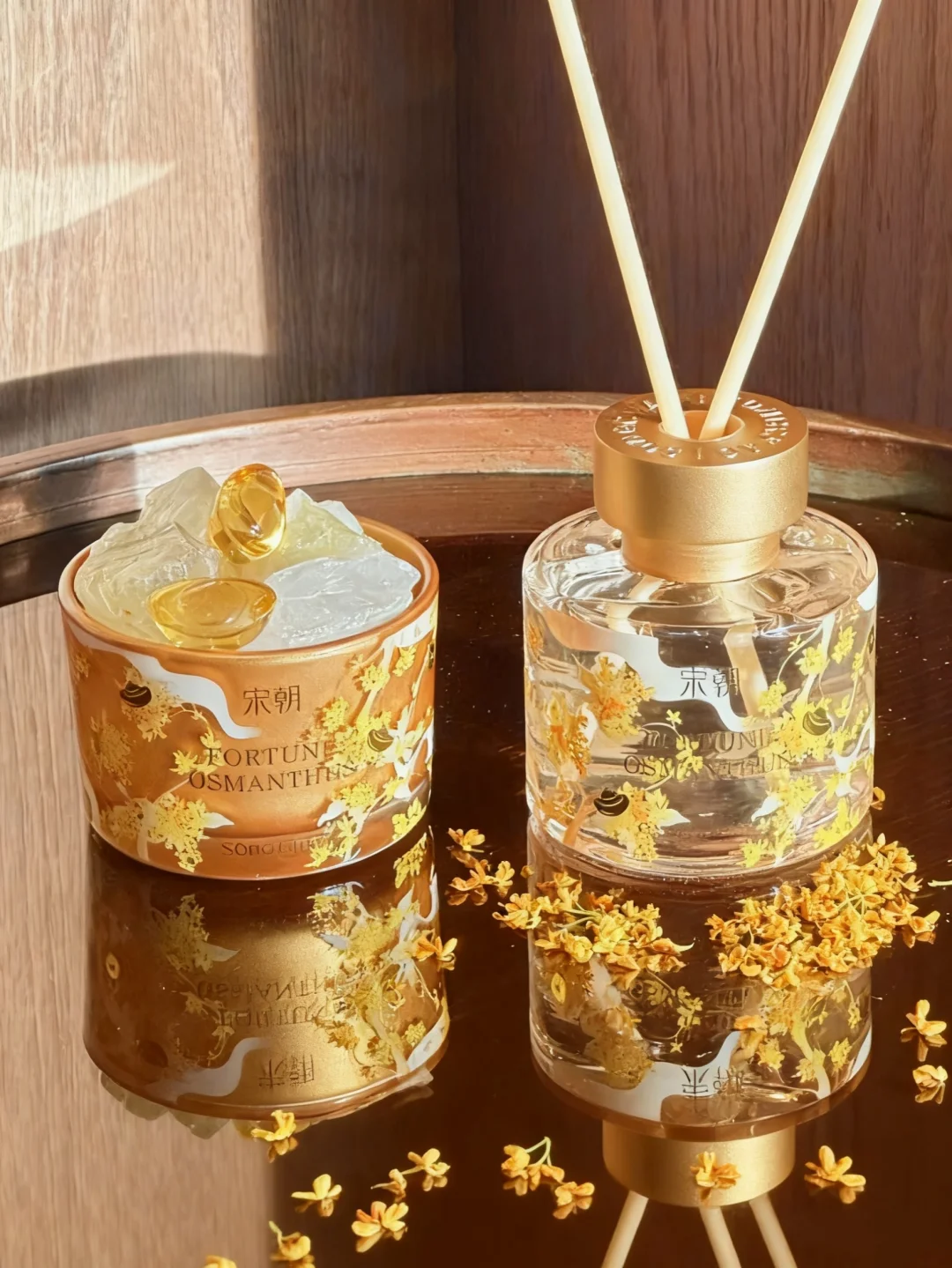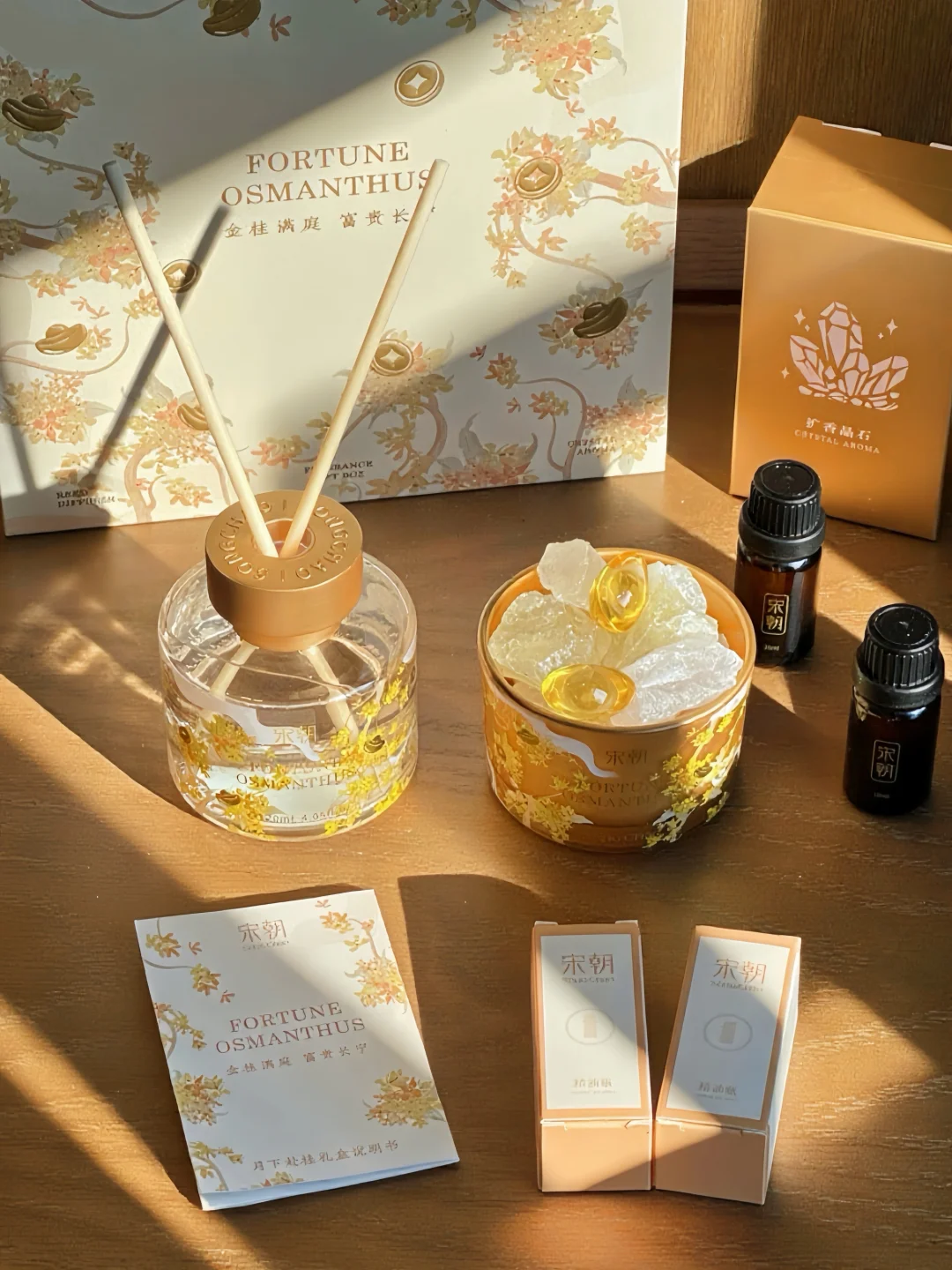 俺的嫡长闺也泰会挑礼物了吧!! 宋朝这个月下赴桂香薰礼盒 礼盒名为“赴桂”寓意着“富贵” 是无火香薰+扩香石的组合 扩香石里有黄白水晶和两颗琉璃元宝 香薰的瓶身上也都是烫金元宝+铜钱纹的设计~ 摆在家里简直贵气满满~ - 打开香薰浓郁又不失淡雅的桂花香扑鼻而来 像是正站在一颗盛开的桂花树下 微风拂过飘零的桂花带着香味 清甜得恰到好处!超级治愈~ - 秋天最不能错过的,就是那一抹桂花香 把整个秋天的桂花香都装进家里啦~ 寓意好又实用滴礼物谁能拒绝呢😍 中秋送给长辈也很合适哦