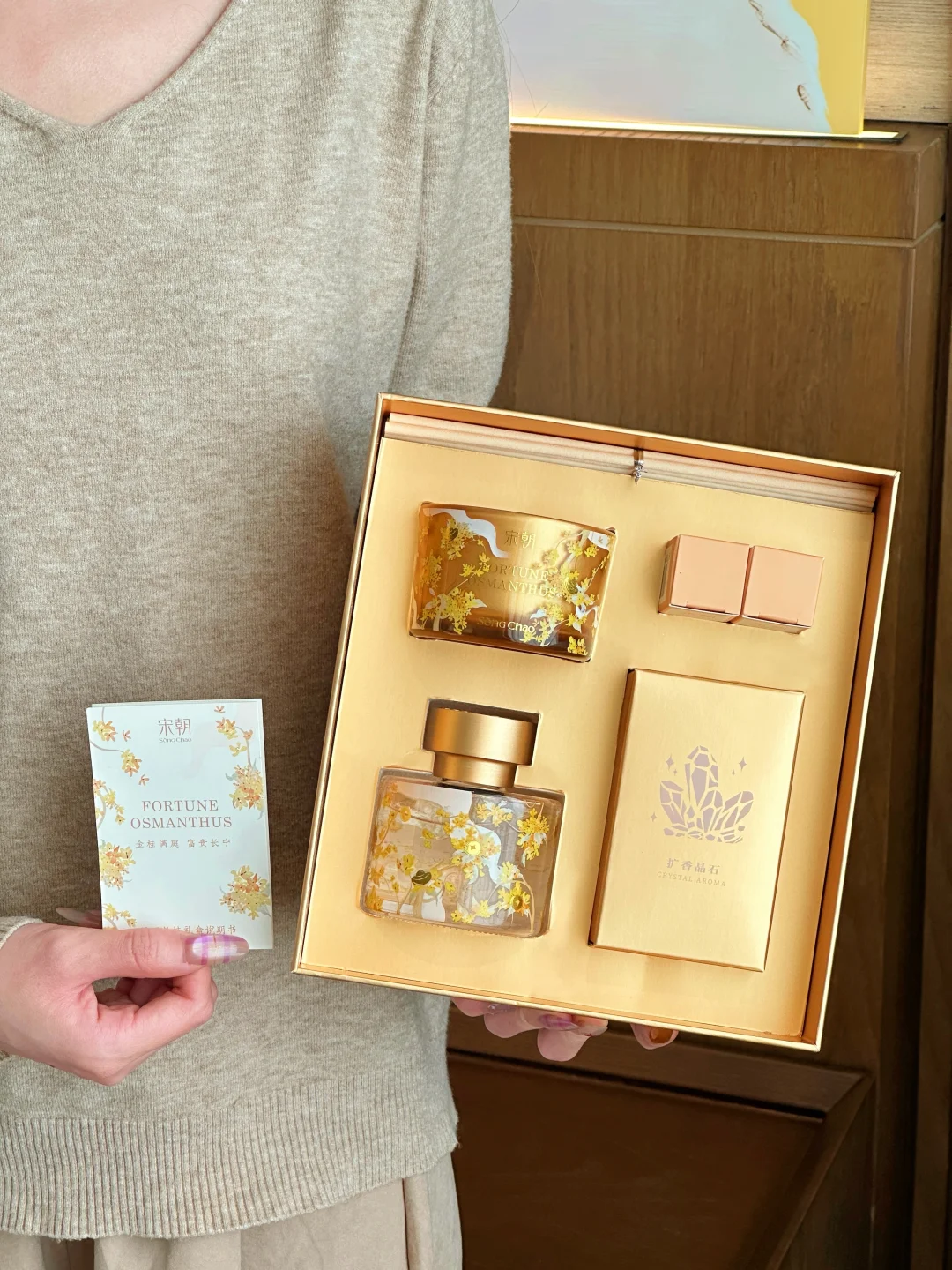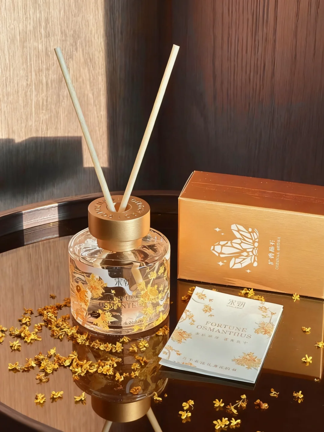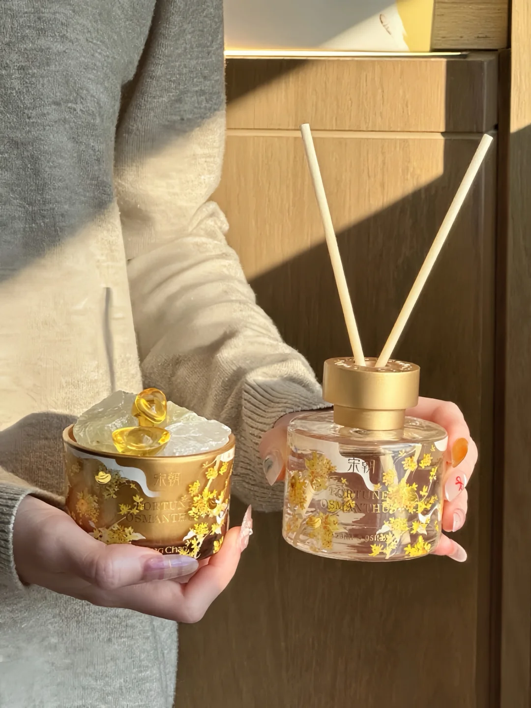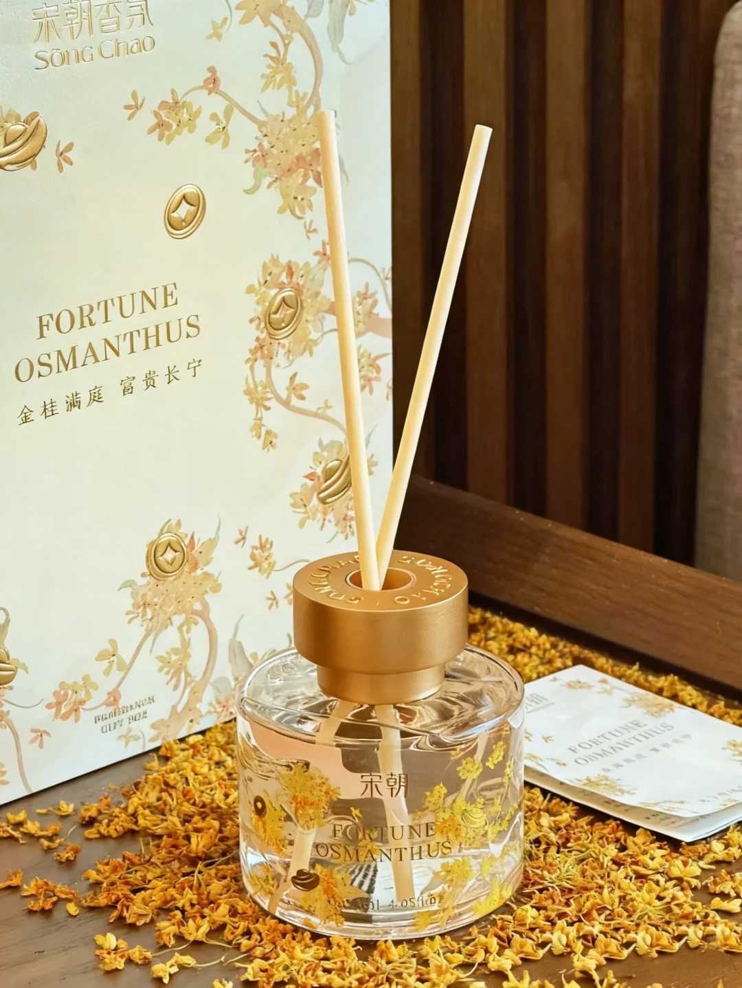 俺的嫡长闺也泰会挑礼物了吧!! 宋朝这个月下赴桂香薰礼盒 礼盒名为“赴桂”寓意着“富贵” 是无火香薰+扩香石的组合 扩香石里有黄白水晶和两颗琉璃元宝 香薰的瓶身上也都是烫金元宝+铜钱纹的设计~ 摆在家里简直贵气满满~ - 打开香薰浓郁又不失淡雅的桂花香扑鼻而来 像是正站在一颗盛开的桂花树下 微风拂过飘零的桂花带着香味 清甜得恰到好处!超级治愈~ - 秋天最不能错过的,就是那一抹桂花香 把整个秋天的桂花香都装进家里啦~ 寓意好又实用滴礼物谁能拒绝呢😍 中秋送给长辈也很合适哦