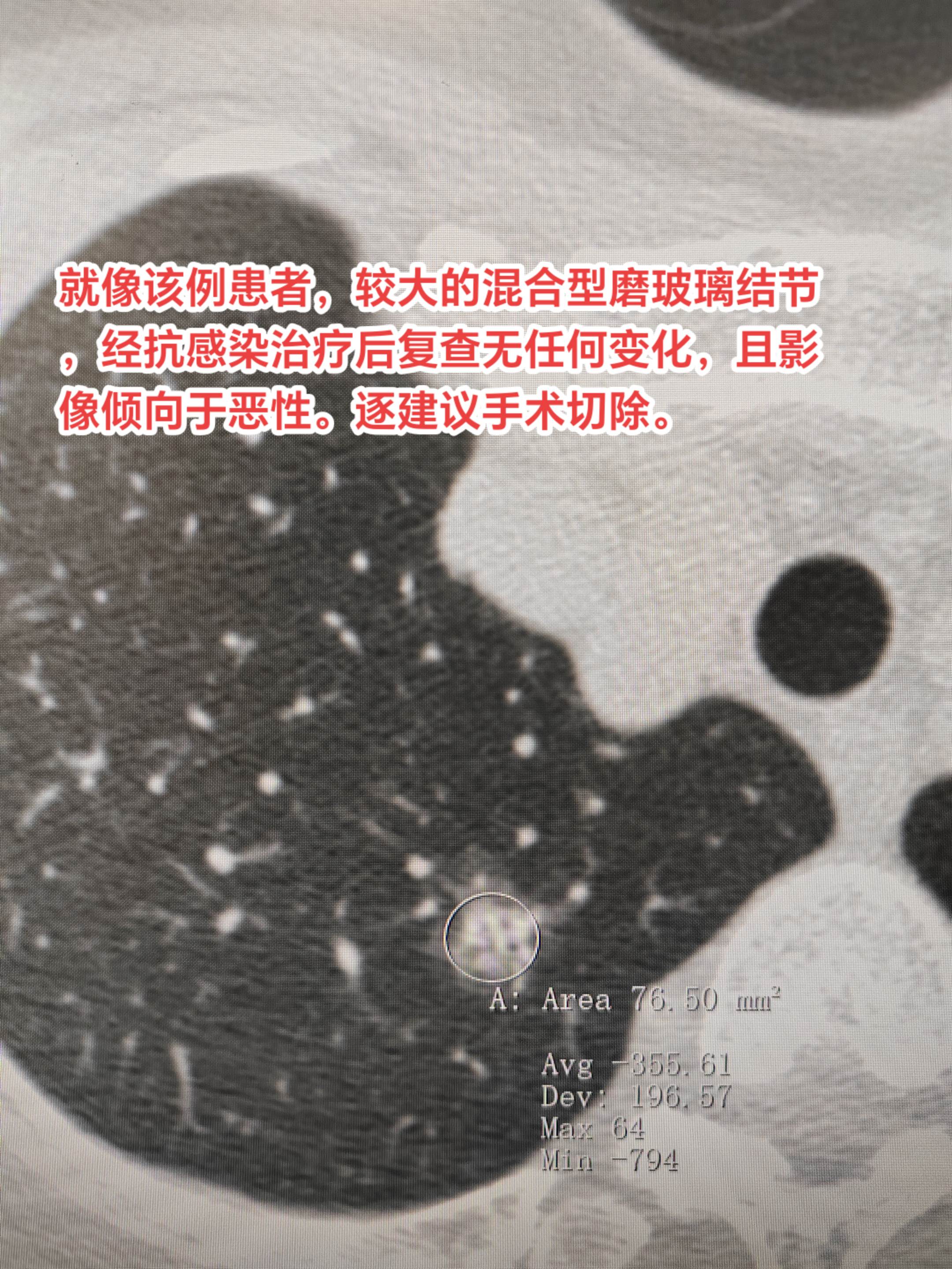 注意这类结节多考虑恶性,需要引起重视。注意这类结节多考虑恶性,需要引起重视。如果报告单中报告超过 1cm 以上的混合型磨玻璃结节,伴有明显分叶、毛刺或胸膜牵拉需要引起警惕。如果是第一次发现,建议抗感染治疗后再复查。若结节缩小或变淡消失多考虑炎症,若不变化大多考虑是恶性。就像该例患者,较大的混合型磨玻璃结节,经抗感染治疗后复查无任何变化,且影像倾向于恶性。逐建议手术切除。
