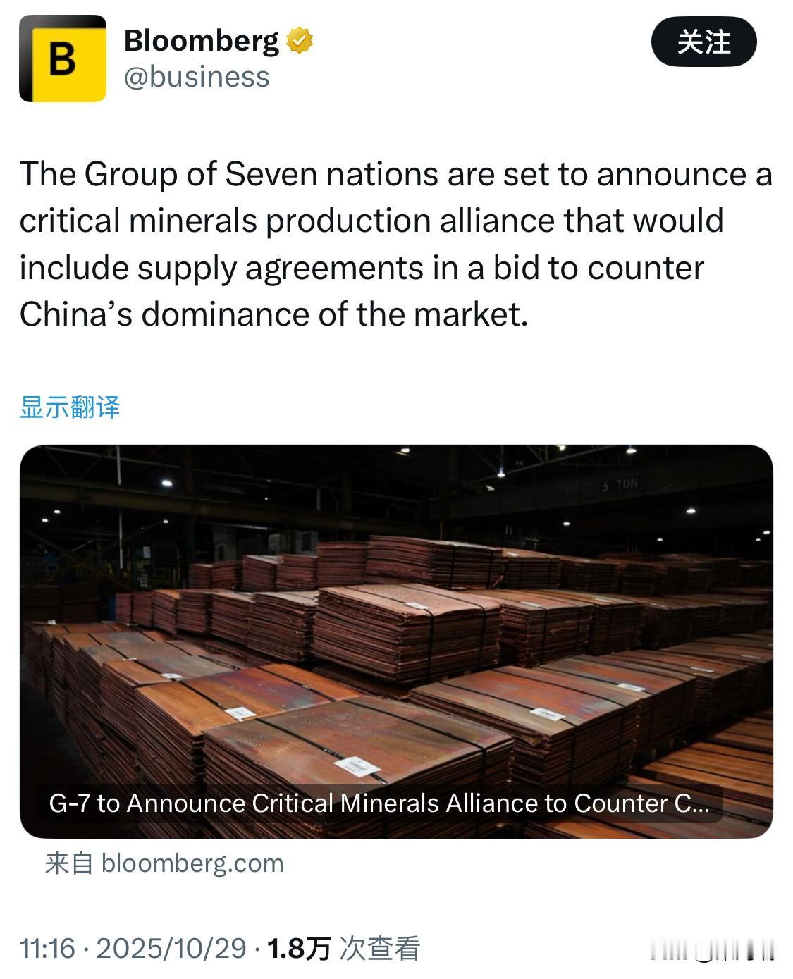 10月30日,据彭博社报道,七国集团(G7)据报将成立关键矿产联盟,以确保在人工智能(AI)、电动汽车和国防等行业所需关键矿产的稳定供应,抗衡zg在该领域的主导地位。彭博社引述一名政府高层官员报道,由美国、加拿大、英国、德国、法国、意大利和日本组成的G7,计划在10月31日于加拿大多伦多召开的能源部长会议收尾时,宣布上述联盟协议。