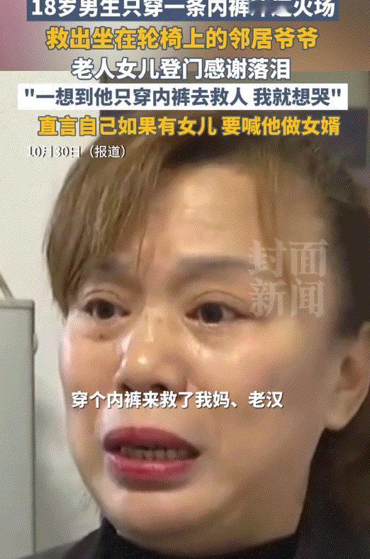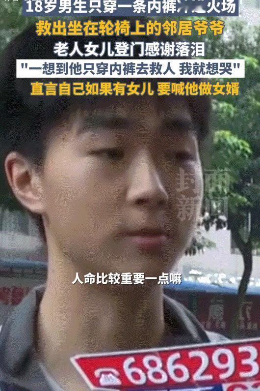 重庆,一18岁高三男生,发现邻居家突然着火,为了救人,男生竟只穿了一条内裤就冲进火场,并及时的救出邻居家两位老人。事后老人女儿得知情况后,感激的买了礼品来到学校感谢男生,并感动落泪的说道“一想到孩子穿着摇裤救人,我就想哭”,后更是直言,如果自己有女儿,一定要他做女婿! 10月29日封面新闻报道,10月16日晚上,重庆的一个小区突然有火光冒起。。   高三学生小祝睡得正沉,隔壁传来的呼救声像针一样扎进耳朵里。   他猛地坐起身,窗外的微光里,能看见门缝里渗进的烟不是,做饭的炊烟,是带着焦糊味的黑烟。   紧急接,带着恐慌的求救声再次从隔壁响起,他想都没想,一把扯掉盖在身上的被子,只穿着贴身的内裤,光着脚就往门口跑。   打开门的瞬间,浓烟裹着热浪扑到脸上,眼睛立刻就酸了。   他往隔壁看,发现老人家里的窗帘已经烧起来,火光把整个房间照得通红。   坐轮椅的老爷爷被卡在门口,轮椅轮子好像被什么东西卡住,老奶奶扶着轮椅扶手,嗓子都喊哑了。   小祝光着的脚踩在地上,才发现走廊地面落了些燃烧后的碎屑,硌得脚底发疼,可他几步就跨到了老人身边。   他先稳住摇晃的轮椅,弯腰检查了一下轮子,发现是烧变形的塑料壳卡住了。   他用手猛地一掰,借着体育训练练出的力气,推着轮椅就往楼道口走。   烟雾里看不清路,他只能凭着记忆往楼下冲,直到把老爷爷推到小区的空地上,才又转身往上跑。   这时老奶奶已经快站不稳了,他赶紧上前扶住老人的胳膊,一步步把人扶了下来。   等消防员赶到把火扑灭,小祝才靠在墙角歇着。   邻居们围过来,有人递给他拖鞋,有人拿毛巾给他擦脸,他这才意识到自己还只穿着内裤,不好意思地红了脸。   后来他说,当时真没觉得丢人,满脑子都是“再晚一点,老人可能就出不来了”。   被救老人的女儿江女士是第二天才知道的事,老人怕她担心,一开始没敢说,江女士提着牛奶和苹果找到学校时,一见到小祝就红了眼。   她拉着小祝的手看了又看,特别是看到他露出的脚踝上面的烫伤,眼泪更止不住了。   她反复说:“要不是你,我爸妈就危险了,你这孩子,真是把人命放在第一位啊。”   小祝的班主任说,小祝平时在学校就很热心。同学打球崴了脚,他主动背着去医务室;班级搬书,他总是扛最重的那一摞。   作为羽毛球特长生,他每天天不亮就去训练,再苦再累也从没抱怨过,这种肯吃苦又乐于助人的性子,让他在危急时刻做出那样的选择,一点都不意外。   这事后来在小区里传开了,大家都知道了这个穿内裤救老人的少年。   有人说,现在的年轻人大多娇生惯养,没想到小祝这么有担当。   也有人提醒,电动轮椅充电确实得注意,最好不要在室内充,更不能用不合规的充电器。   有人苦夸赞小祝是英雄,他倒觉得自己只是做了该做的事。   可这份“该做的事”,恰恰藏着如今青少年的社会担当。   不是只有惊天动地的举动才算担当,危急时刻愿意站出来,看到别人有难不肯袖手旁观,这种发自内心的善意和勇气,就是最鲜活的担当。   小祝的事也让大家明白,年轻一代从来不是娇生惯养的代名词,他们心里装着别人,关键时刻靠得住,这就是咱们身边最真实的青春力量。