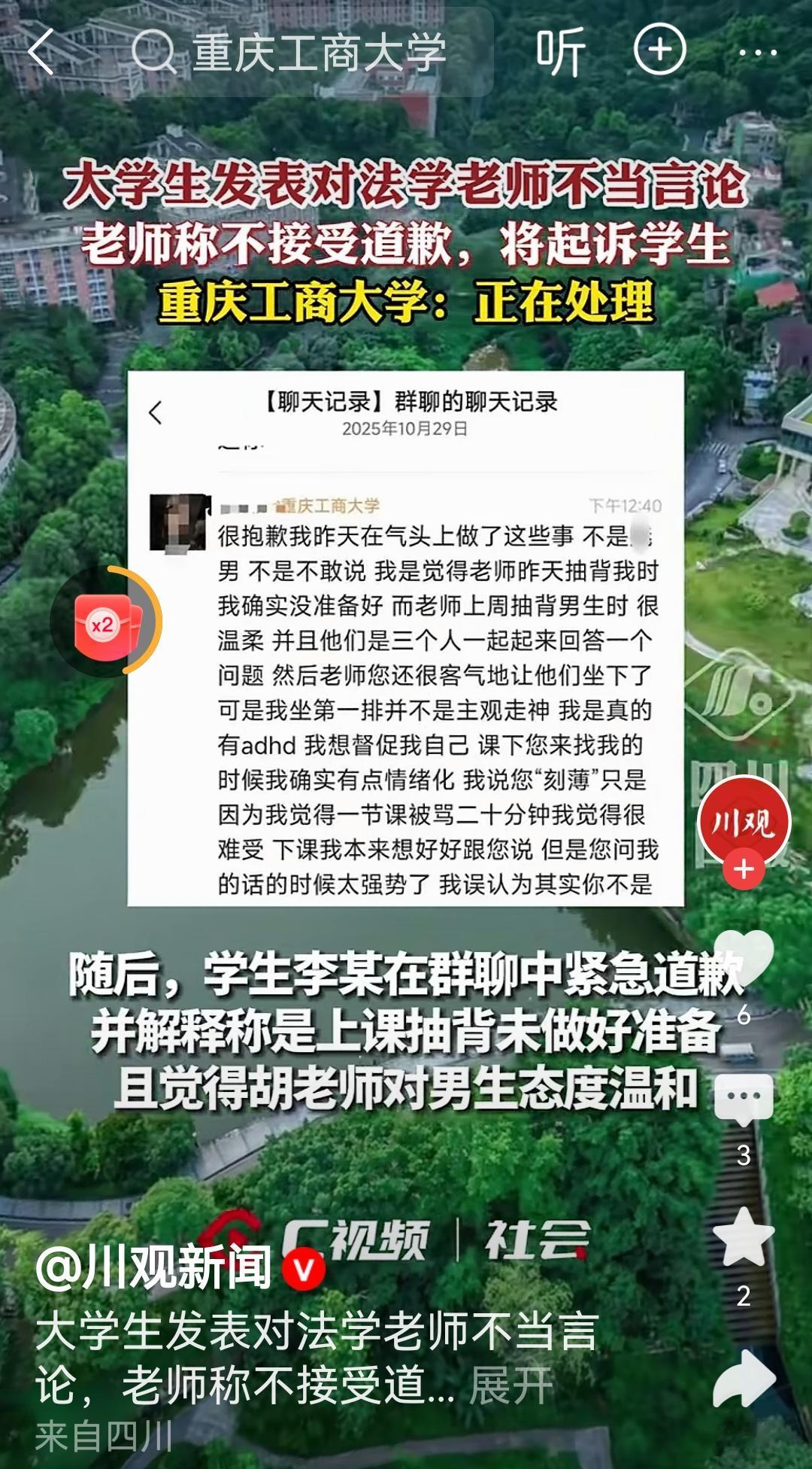 重庆工商大学这位同学 你是凭什么觉得你造谣了老师 只是道个歉就能翻过去呢 凭你是个小仙女? 想学杨某媛的伎俩?在古代诬告是要反坐的。 现在是法治社会,不会容许你胡作非为的。 就等着法律的制裁吧