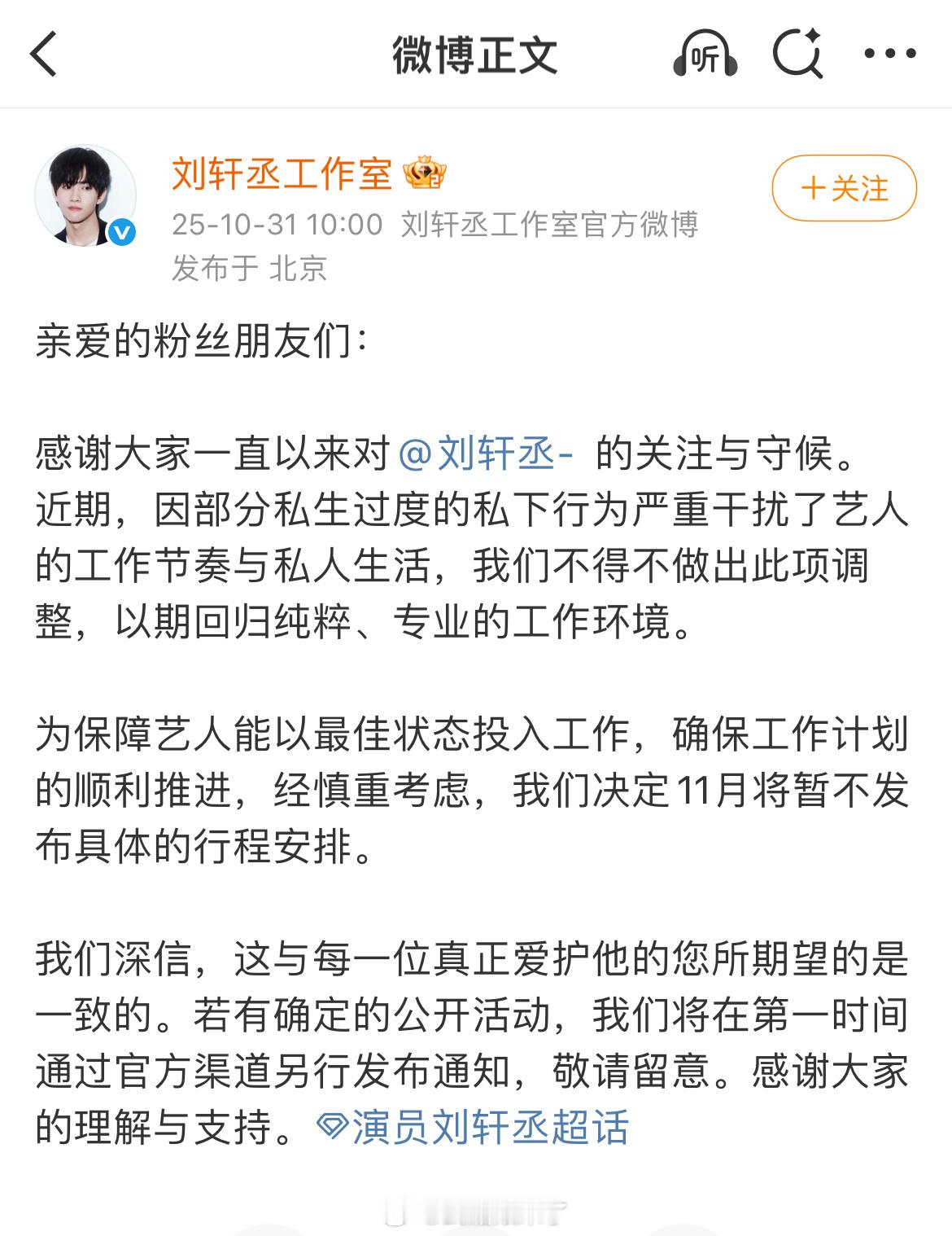 刘轩丞工作室发文称因私生问题严重干扰艺人的工作节奏和私人生活,因此决定暂不发布11月行程。
