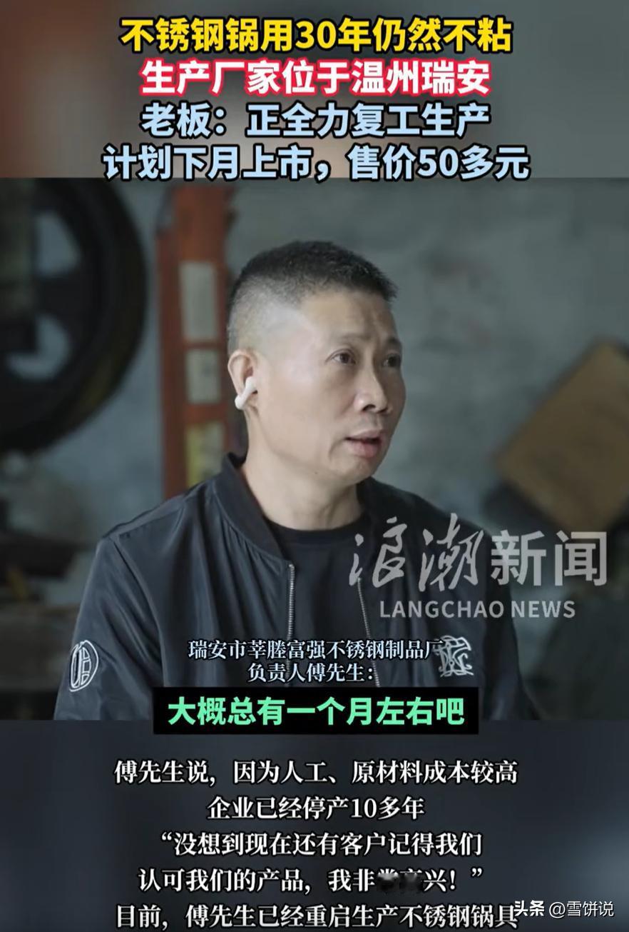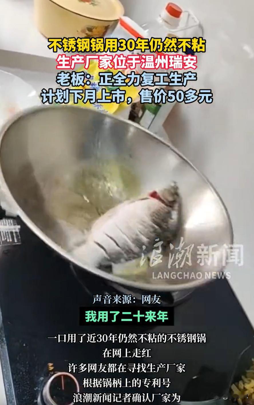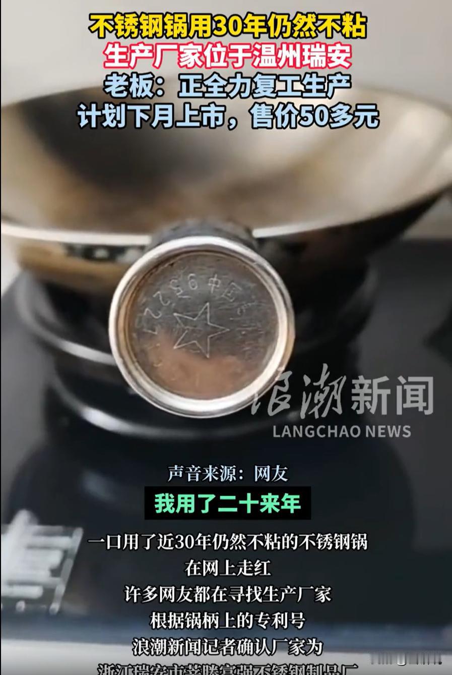 浙江,一位阿姨随手拍了一段视频,夸了夸家里那口老锅。她说这锅用了快三十年,炒鸡蛋从来不粘,平时刷锅用钢丝球猛擦,也不见半点锈迹。视频一火,网友顺着锅柄上的专利号往回查,竟挖出了一家停产十年的老厂。厂老板接到电话时还以为是恶作剧,直到网友一通问锅,他才发现当年那口老锅居然又火了 其中有网友找到了一家已经停产十年的老厂。厂子早就停工,机器也静置多年,但老板的电话还能打通。不少人直接打过去问,这锅现在还能不能买到 老板接到电话也很意外。他说,当年没有销路,再加上不锈钢原料涨价,厂里不愿意降低品质、用薄料或者次料去糊弄人,干脆就停了产。那些老设备一直没舍得卖,放在厂房里,总觉得有一天还能用上 没想到,这一天真的来了 在网友的热情催促下,老板决定重新开工。他计划沿用原来的老手艺,还把锅体加厚了一点,锅柄焊接得更牢固。最让人意外的是,这样一口实打实的不锈钢锅,预售价只要六十块钱。对比现在市面上动不动几百块、还娇气得不让用铁铲的涂层锅,这价格简直像穿越回了二十年前 有网友调侃:一个锅能用30年,这质量能难怪没有销路 这话听着像玩笑,其实挺有道理。一个锅能用三十年,你让厂家怎么有销路?大家都没有换锅的理由,只能说这质量放到现在,确实“太实在”了 30年不粘不锈钢锅复产预售50多元