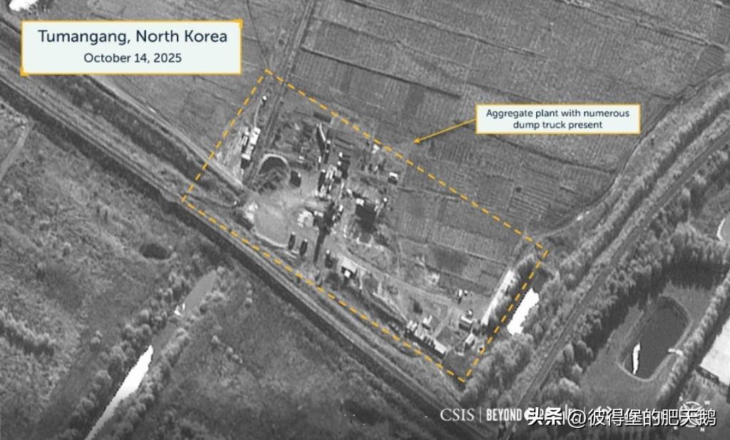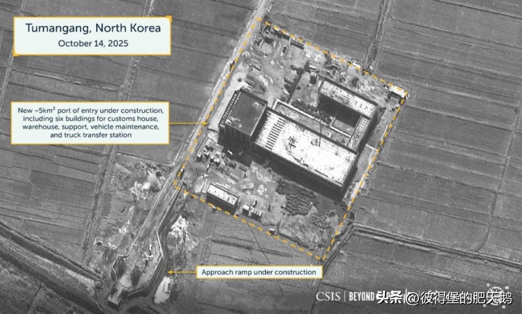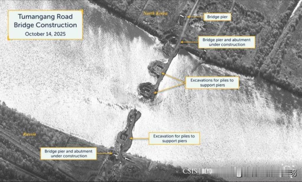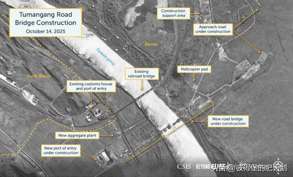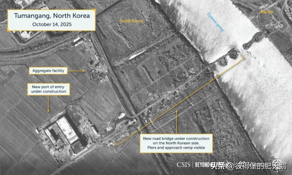 美国战略与国际问题研究中心发布了正在建设中的从俄罗斯到朝鲜、横跨图们江的大型公路桥的卫星图像。拍摄于 2025 年10月14日。 这座桥建在旧铁路桥附近,金同志曾乘坐装甲列车通过那座旧铁路桥前往俄罗斯。 在俄朝同盟关系热火朝天的背景下,这座桥无疑是必要的,它将承担补充从朝鲜到俄罗斯的铁路和海上运输的职能,其中一部分货物运输内容必然是军事物资(武器弹药等)。当然,反向运输的物资也会有很多。 在朝鲜境内离大桥不远的地方(铁路线旁),一处边境仓库主体建筑已基本完工。该仓储设施将会接收和发运俄朝货物。 根据官方声明,由朝鲜承建的图们江新桥将于2026年交付使用。 #超1万名乌军士兵被围# #俄乌冲突# #热点解读#
