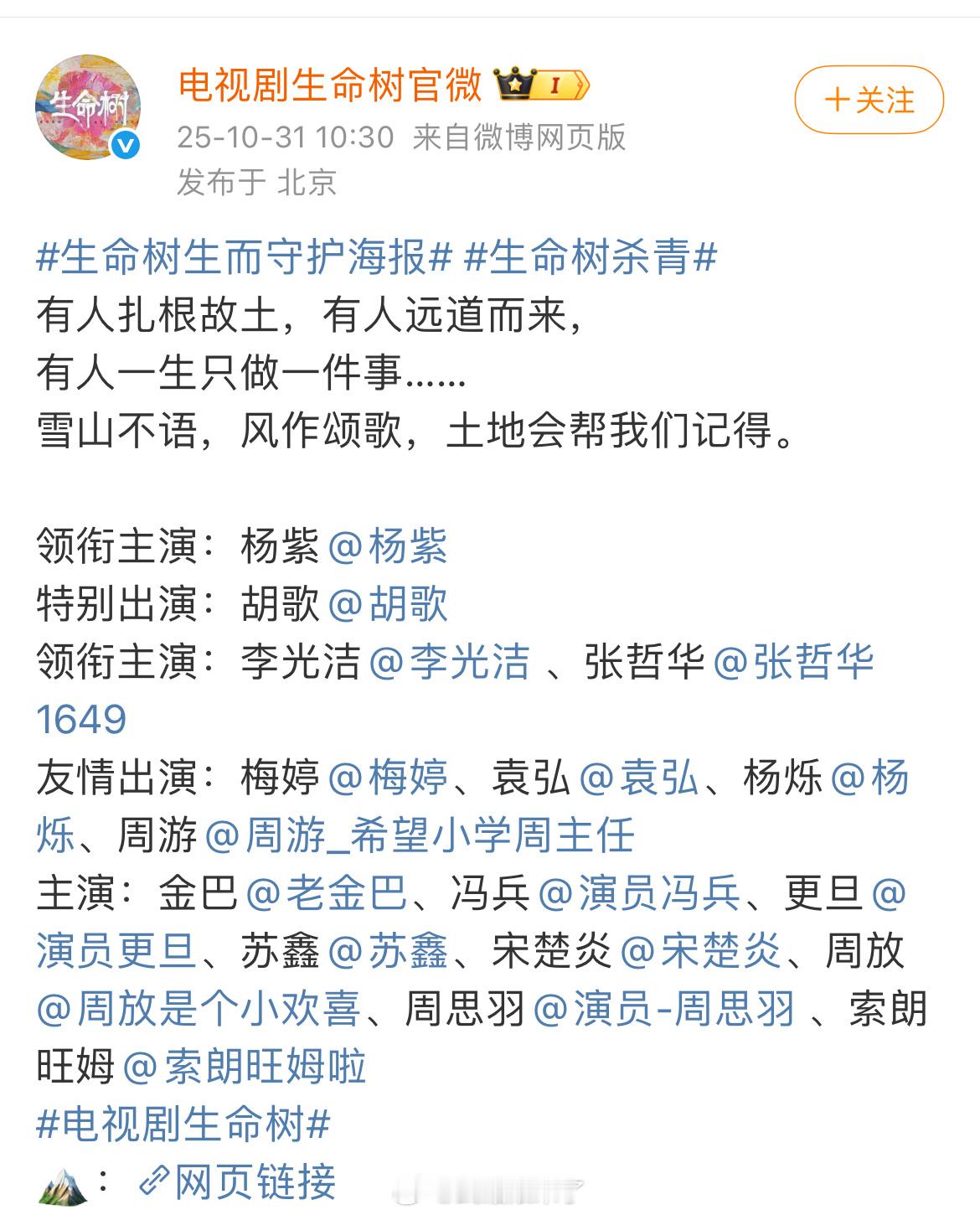 恭喜杨紫、胡歌主演《生命树》正式杀青