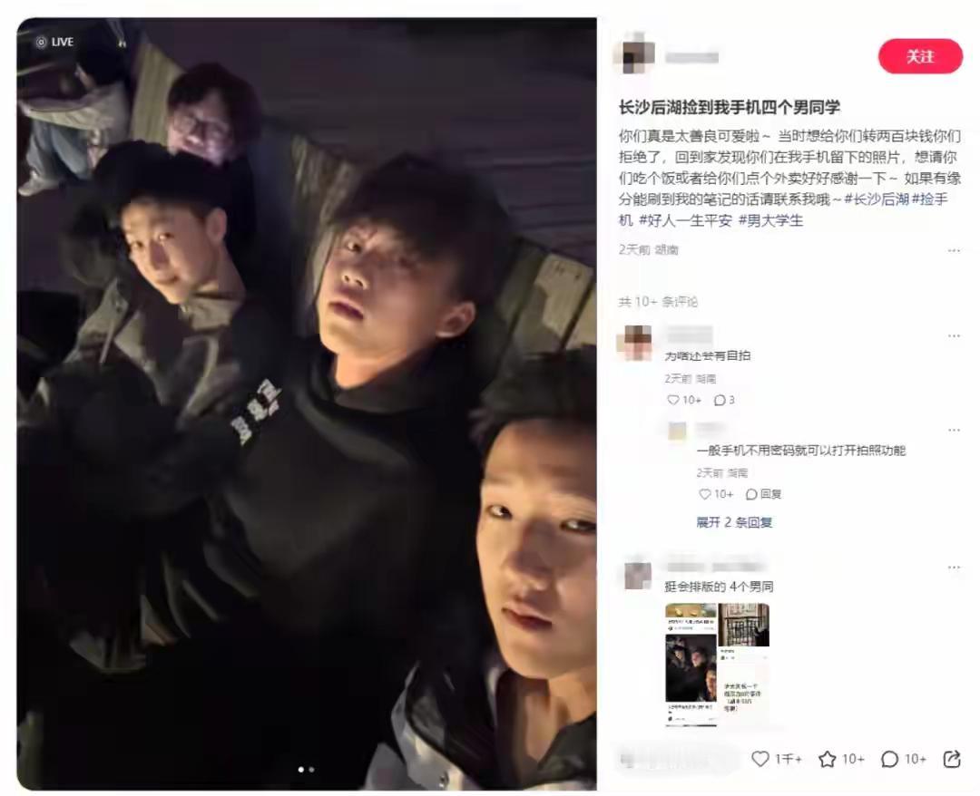 “这操作太暖了!”长沙一女子不慎丢失手机,被4名男大学生捡到后,不仅原地等候归还