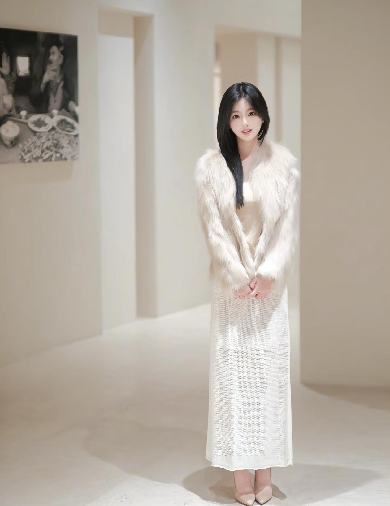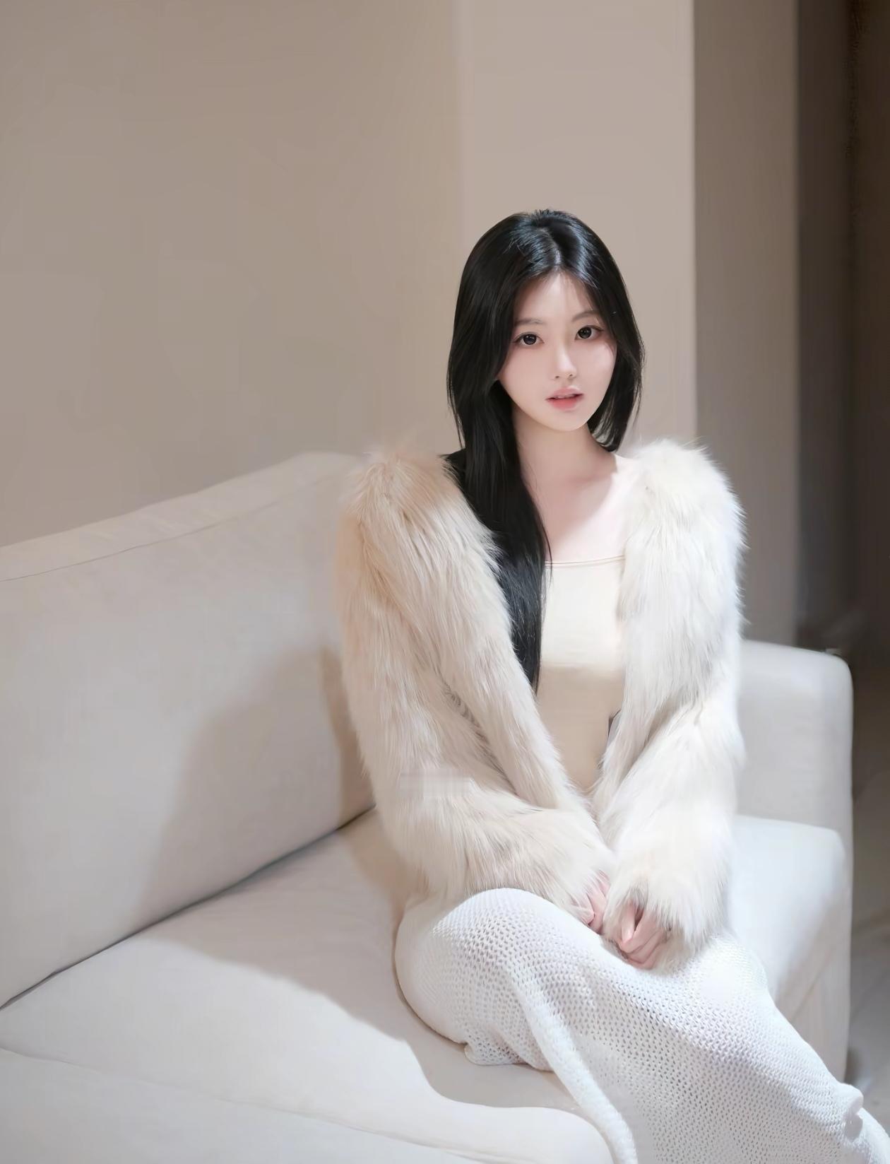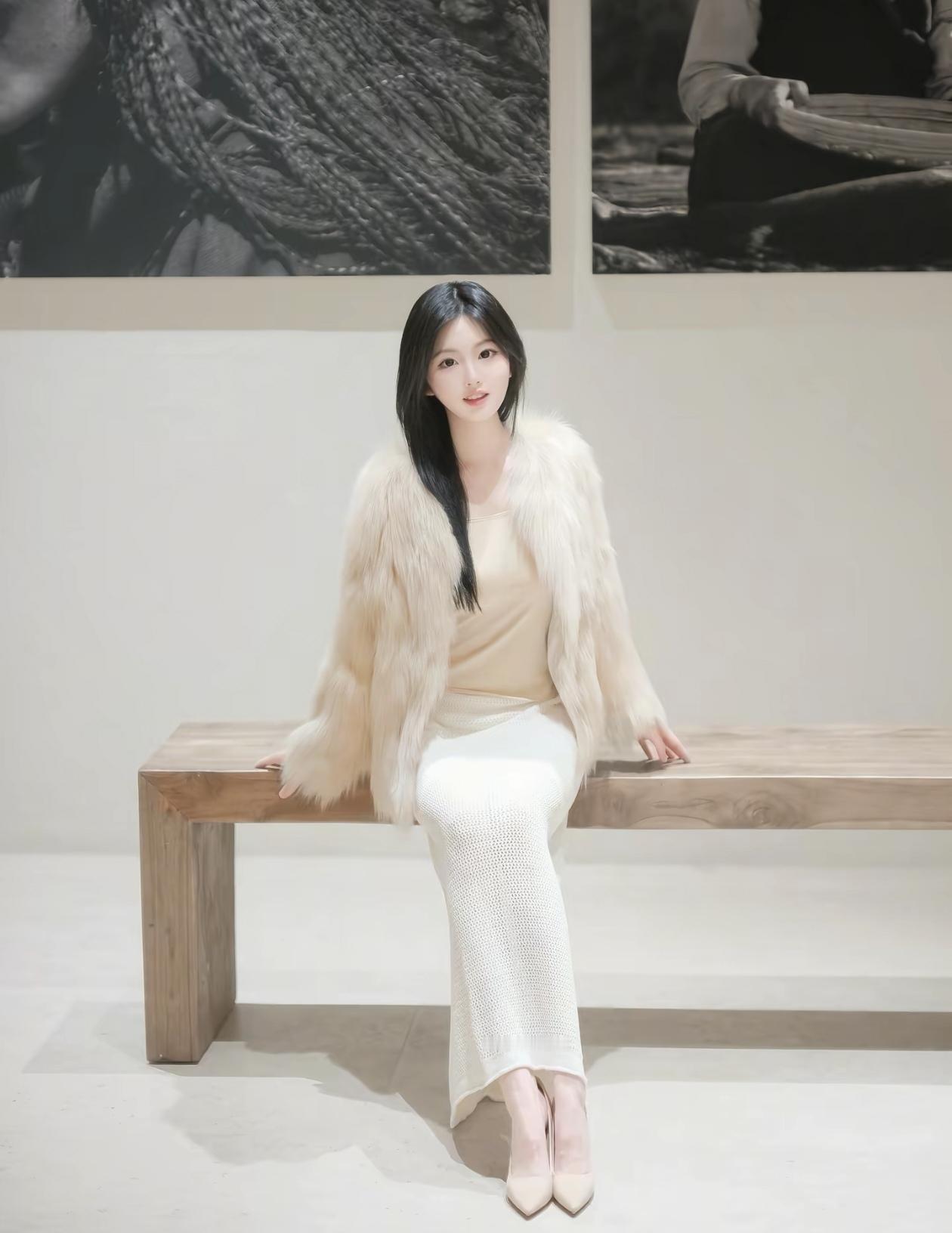 冬日暖阳下,优雅的白色裙装与毛绒外套相得益彰,静坐长椅,享受宁静时光。