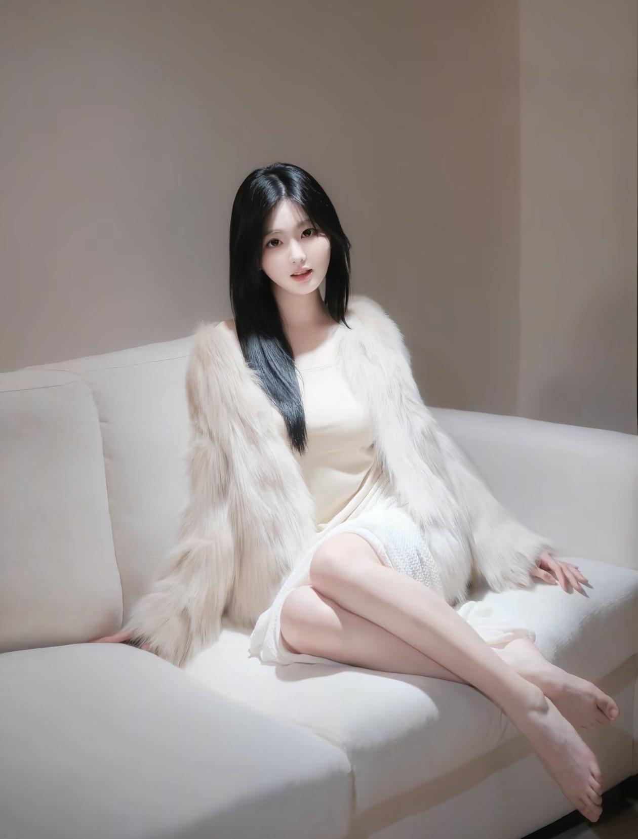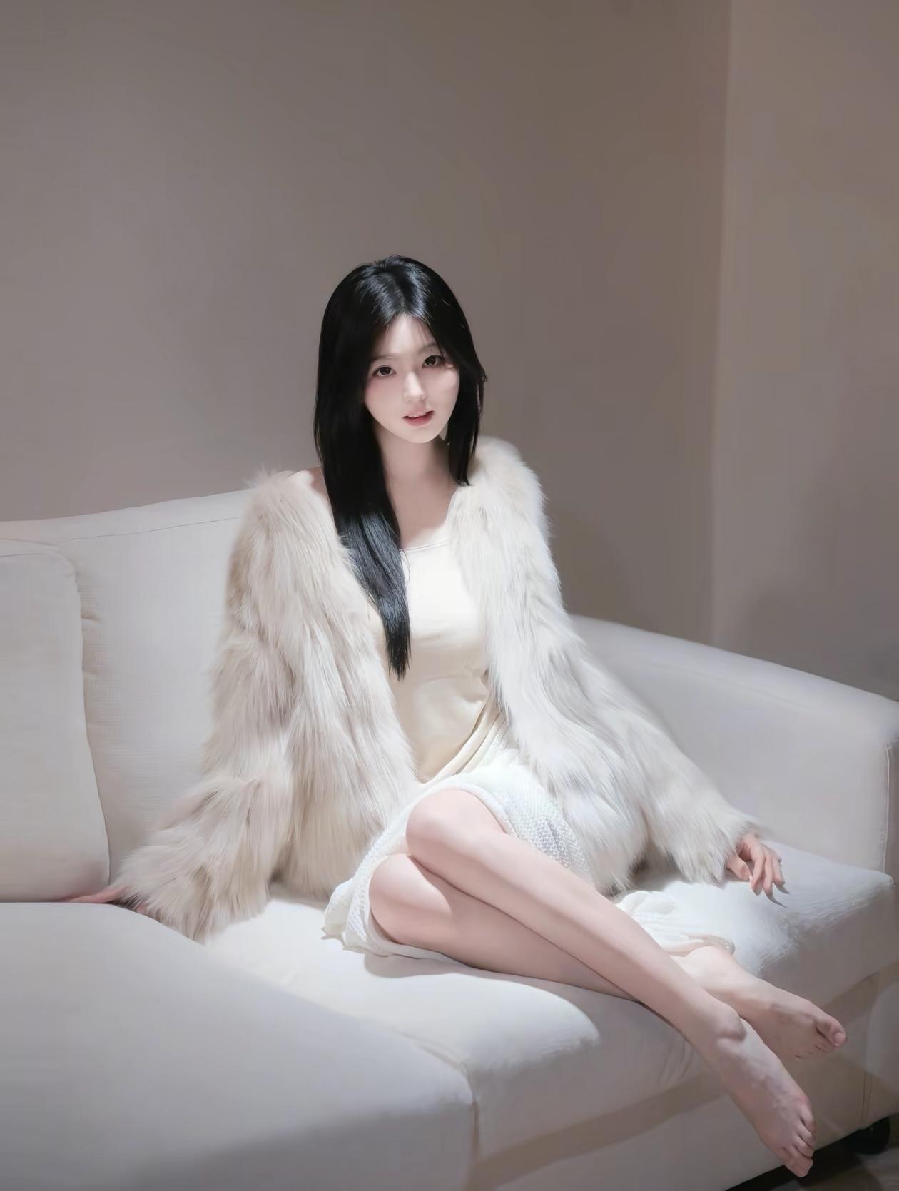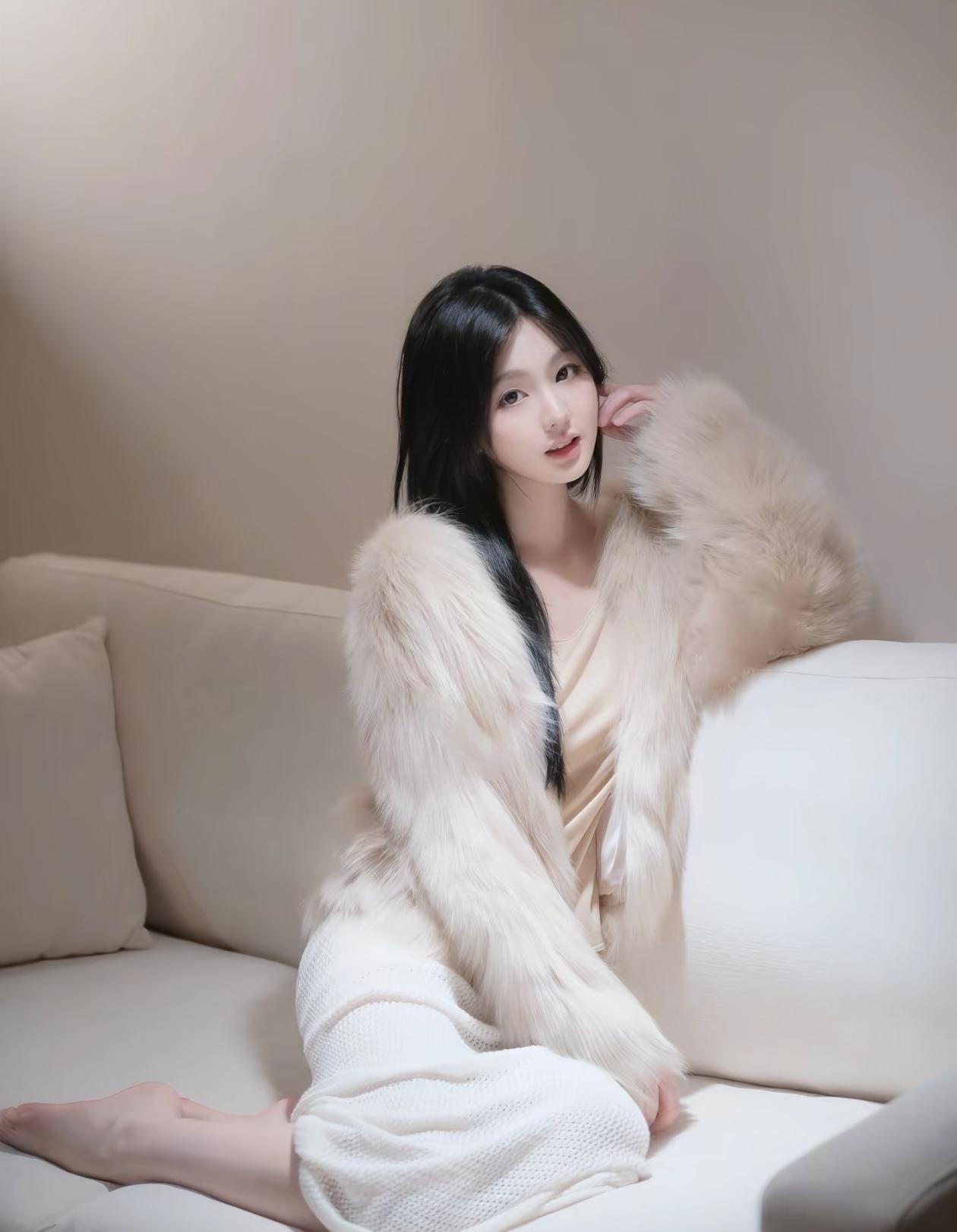 冬日暖阳下,优雅的白色裙装与毛绒外套相得益彰,静坐长椅,享受宁静时光。