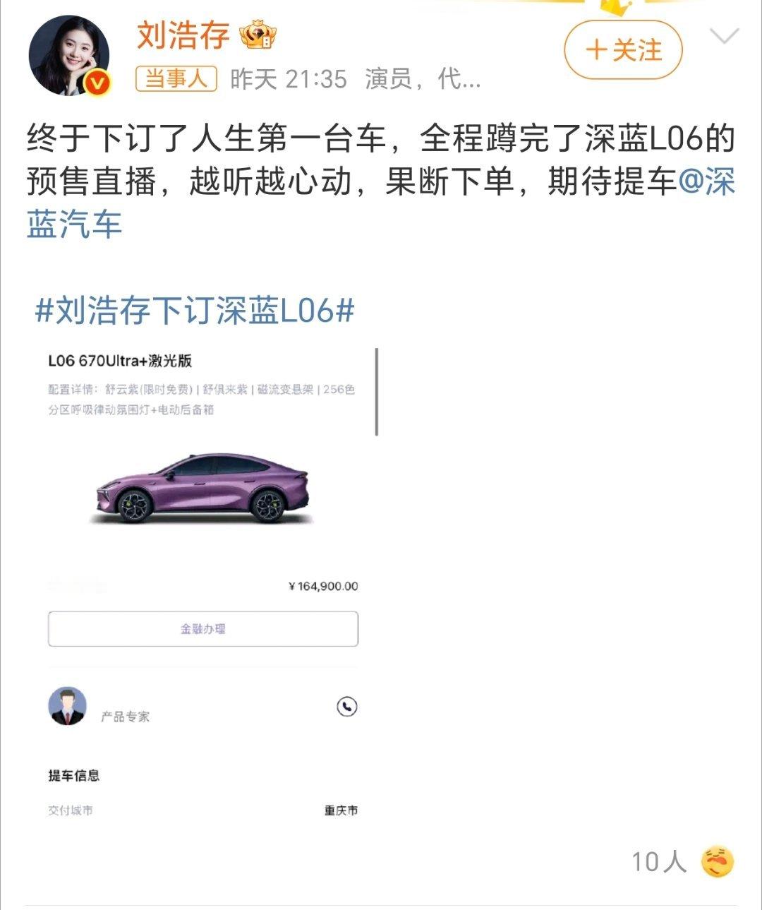 刘浩存晒新车订单这款紫色真好看!