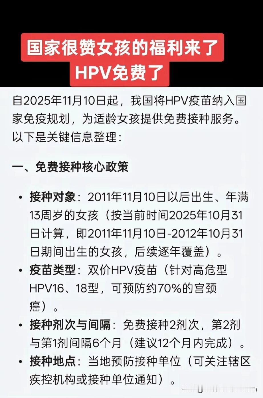 国家出手了! 13岁女孩免费接种HPV疫苗,2025年起实施! 重磅好消息!七大部门联合发布通知:HPV疫苗正式纳入国家免疫规划! 从2025年11月10日起, 所有2011年11月10日后出生、年满13周岁的女孩,都可以免费接种2剂次双价HPV疫苗(两针间隔6个月)。 为什么选定13岁女孩? ✅世卫组织推荐9-14岁未发生性行为女孩为主要接种人群 ✅符合我国女孩发育特点和国情 ✅双价HPV疫苗安全有效,产能充足 这意味着更多女孩能及时获得宫颈癌保护,家庭省下千元接种费用,“健康中国”又迈出坚实一步! 还记得前几年为抢HPV疫苗排长队、花高价的日子吗? 如今国家买单,真是实实在在的惠民政策! 网友感叹:国家富强了,真好! 你家有符合条件的孩子吗? 欢迎转发这个好消息! (文章素材来自网络,侵删)