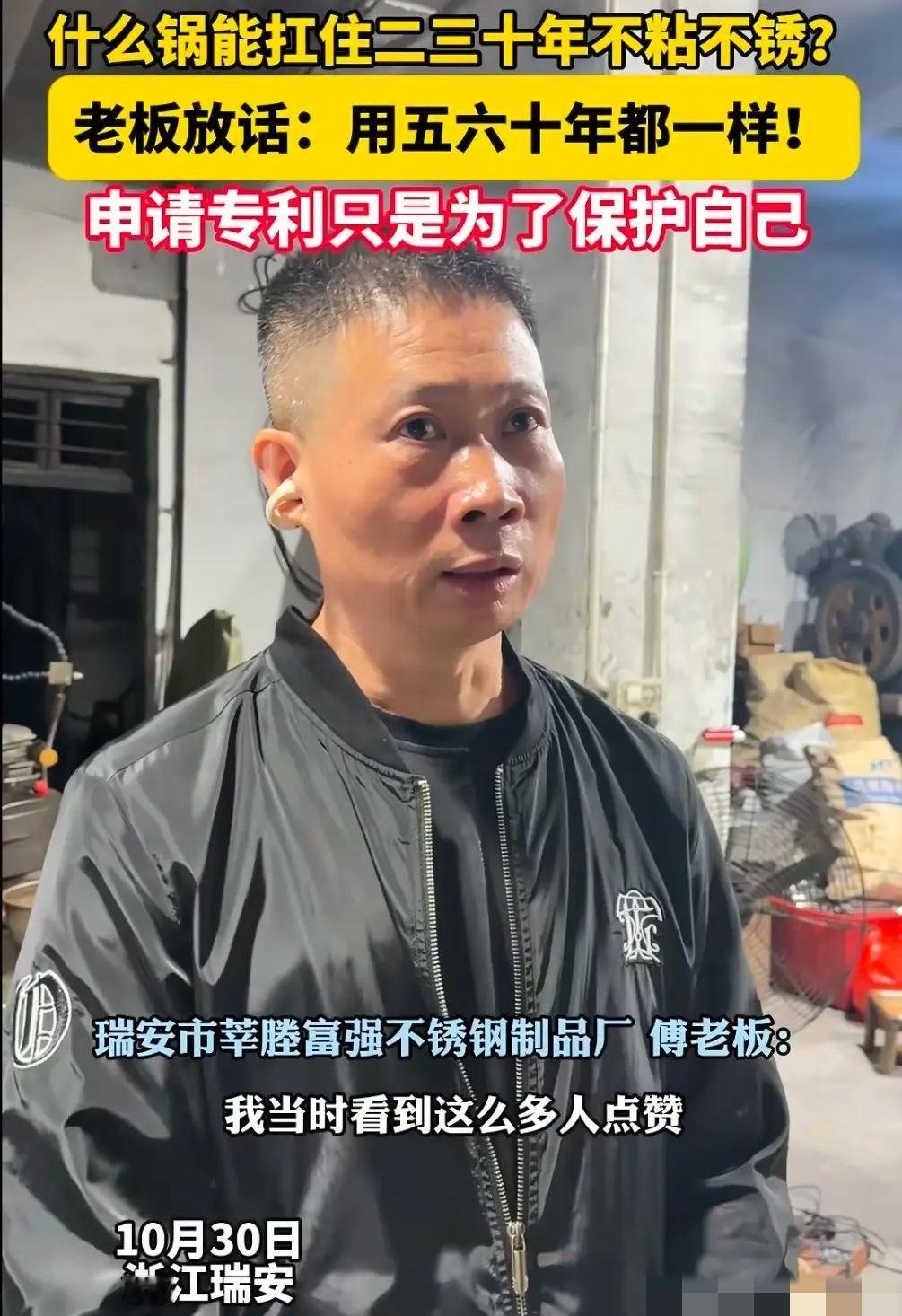 瑞安铁锅的老板可太猛了! 他家那用30年都不粘的不锈钢锅,老板说早前销量不错,后来停产,是工资和原材料价格猛涨闹的。 好多网友私信夸锅质量好能用30年,老板还“傲娇”表示,正常用60年都没问题。如今老板复产,还保证质量不变,绝不为了赚钱偷工减料,第一批锅预计一月后上市。 这老板蛰伏十几年,突然迎来泼天富贵,发视频的女网友真是他的大贵人。从老板说话小心翼翼,能看出是个老实本分人,都说相由心生,这锅或许也跟老板一样实在。大家觉得这老板靠谱不,这复产的锅值得买不?快来聊聊!